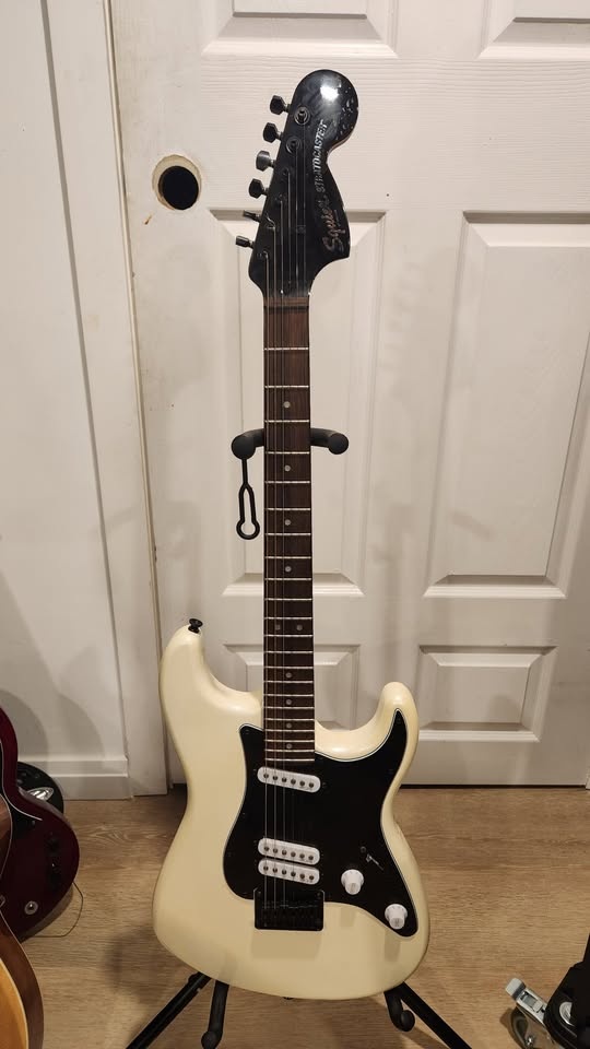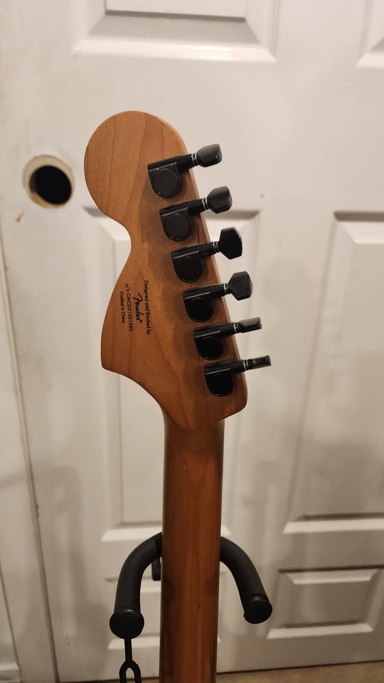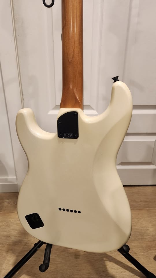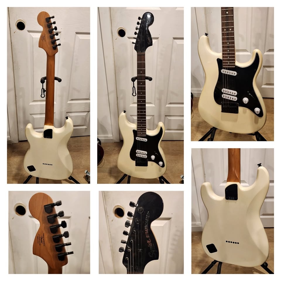 This guitar was built in 2021 with a roasted maple neck, poplar body, Indian laurel fretboard, black hardware, hardtail bridge, contoured heel, 3x Squier SQR alnico single-coils (SSS), and a 5-way blade switch with special series/parallel and hum-cancelling options. It retailed for $549 + tax new and is no longer produced.