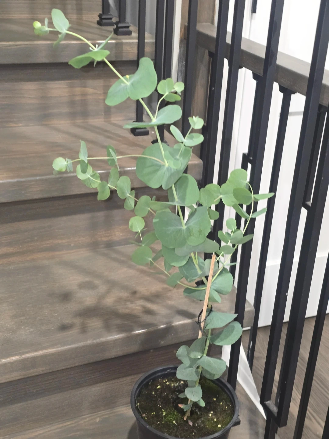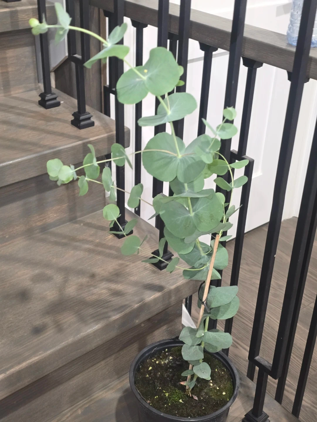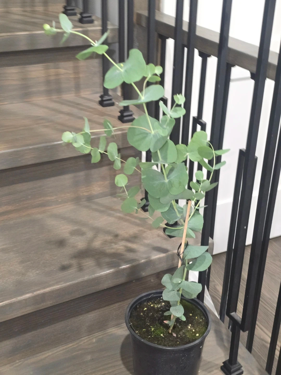 A young Eucalyptus plant in a black pot. It's supported by a stake to help it grow upright. Great for adding some greenery to your space!