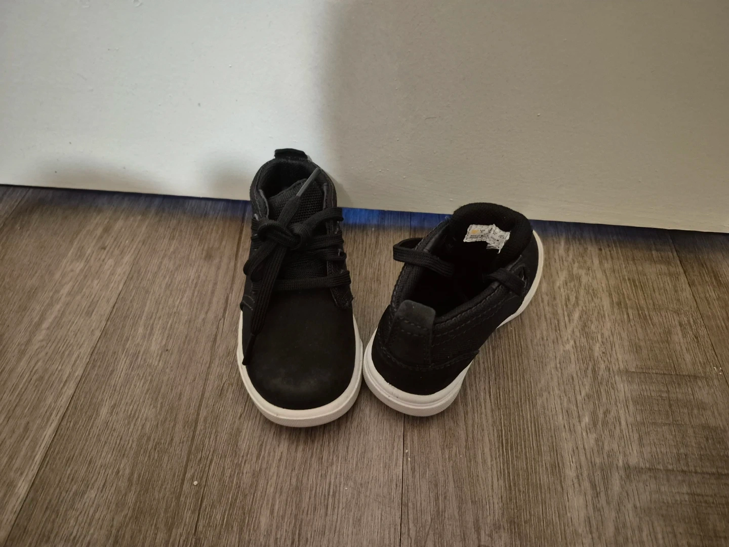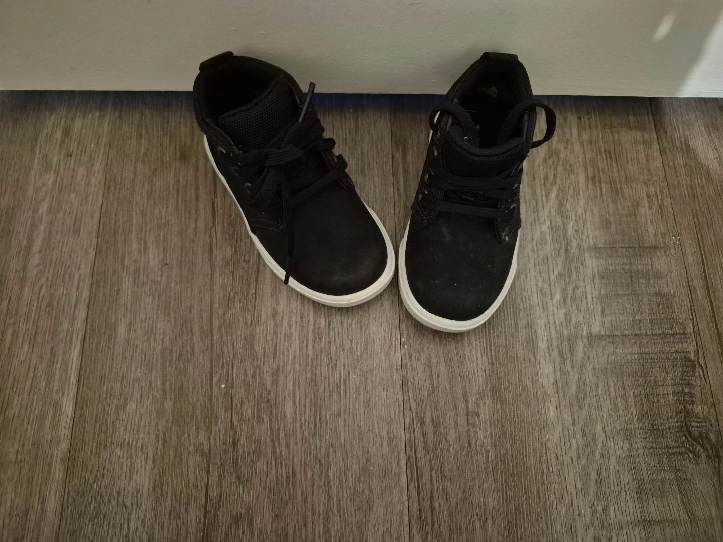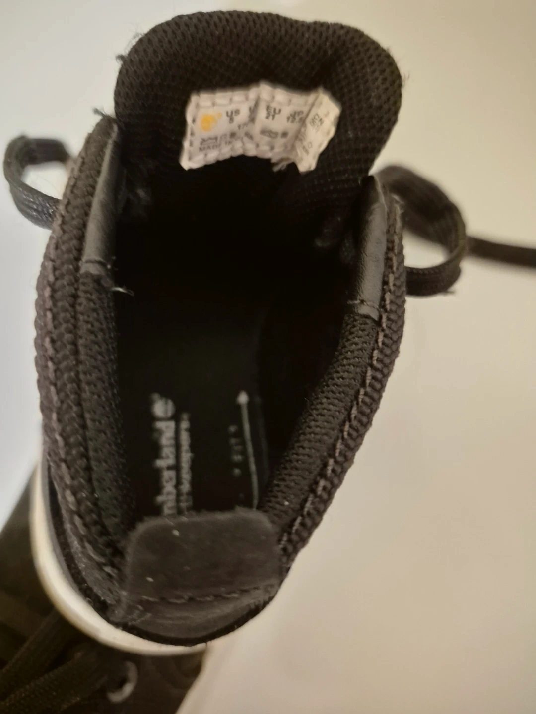 Black Timberland chukka boots for kids. They're a size 4. These boots are great for keeping little feet warm and stylish.