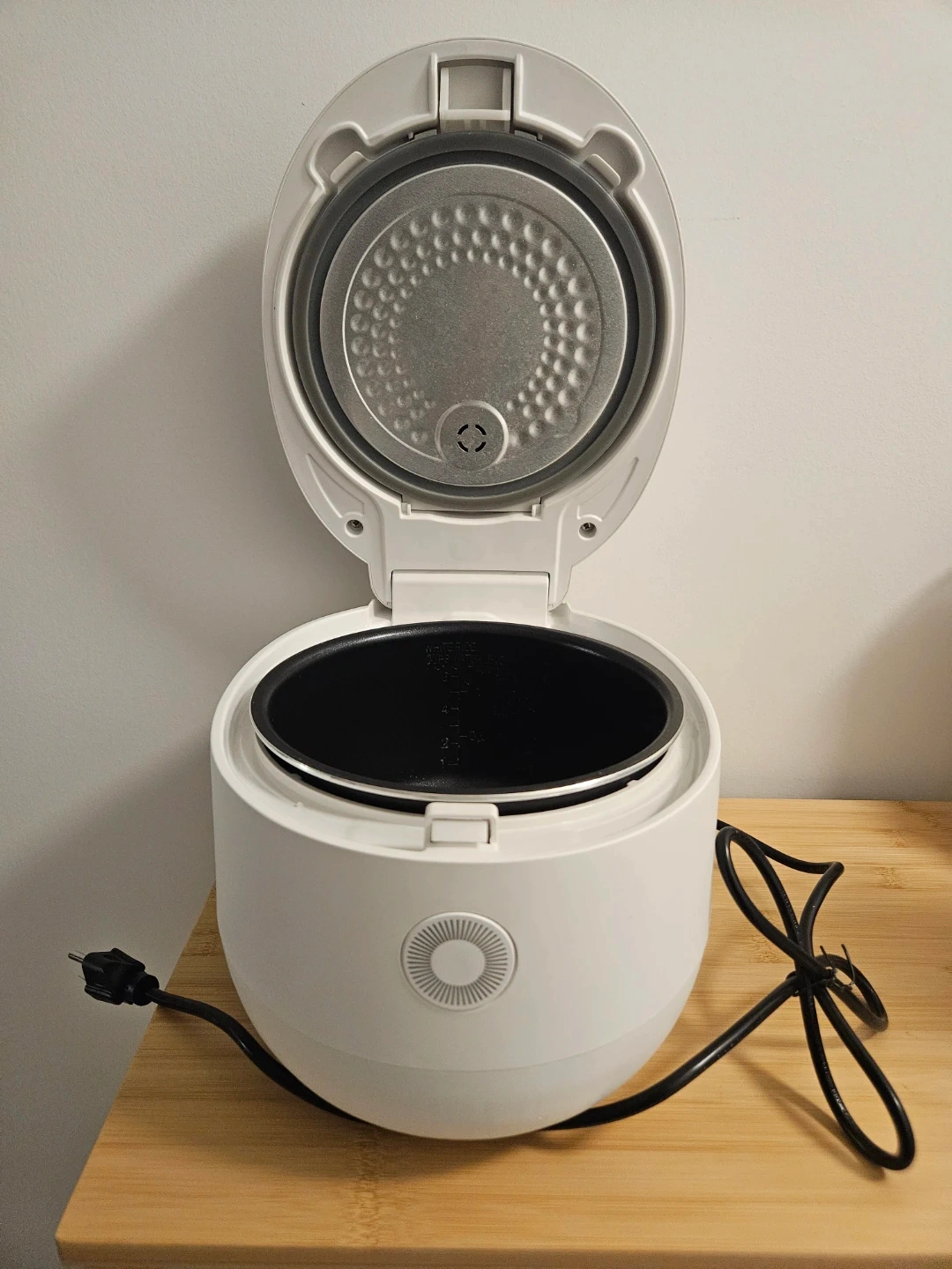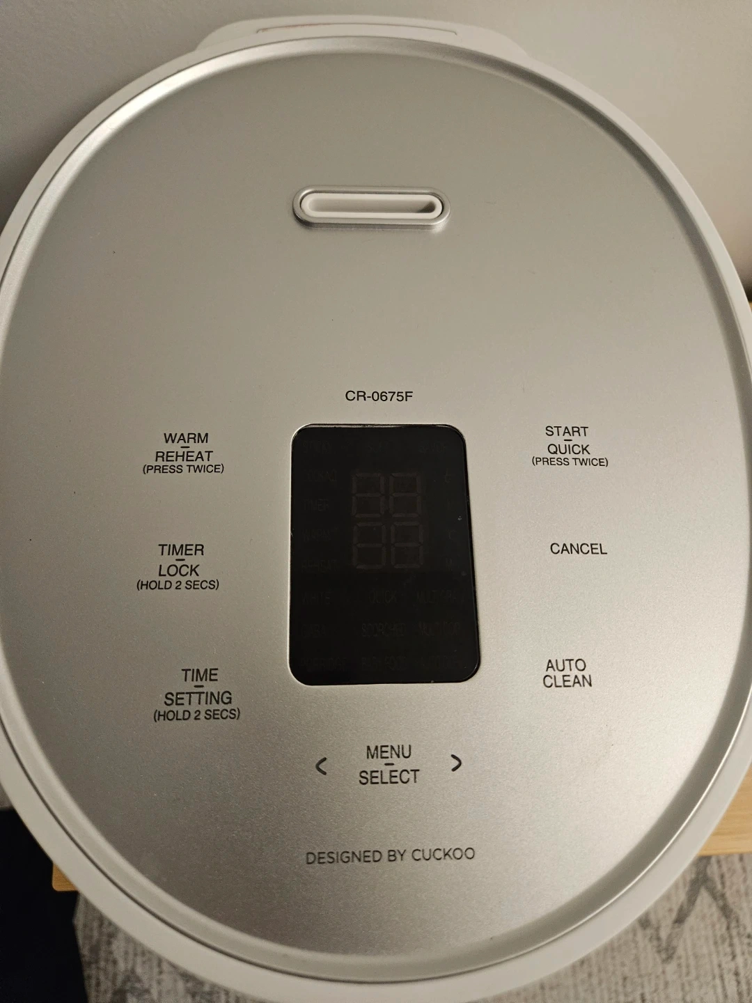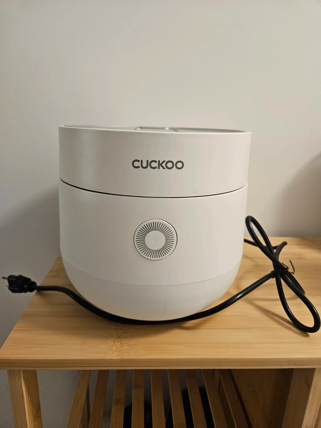 Cuckoo rice cooker with timer and auto clean functions. It has a compact design and is easy to use. Perfect for small kitchens or dorm rooms!