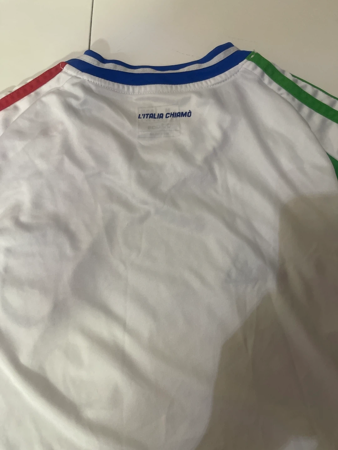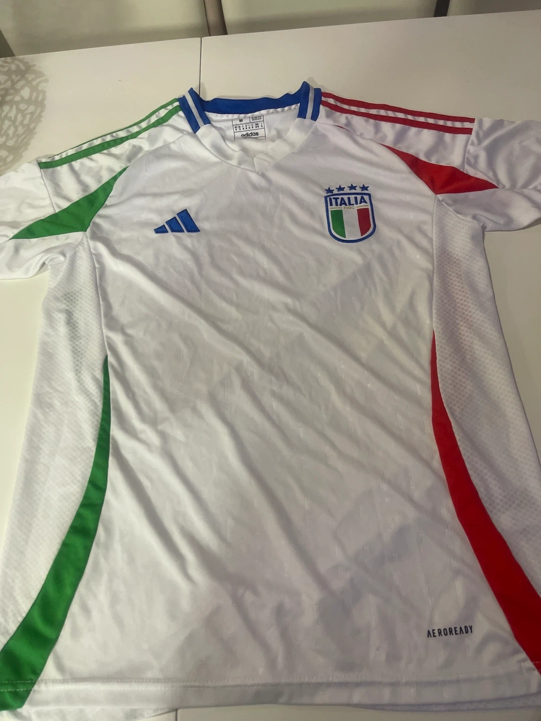 White Adidas soccer jersey featuring the "L'Italia Chiamò" graphic on the back. It's a size medium with Aeroready technology. Made in Thailand.