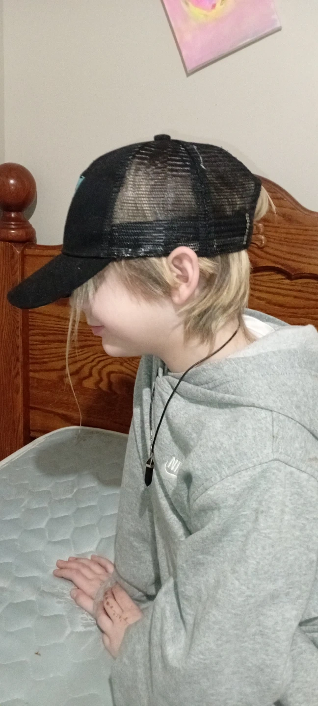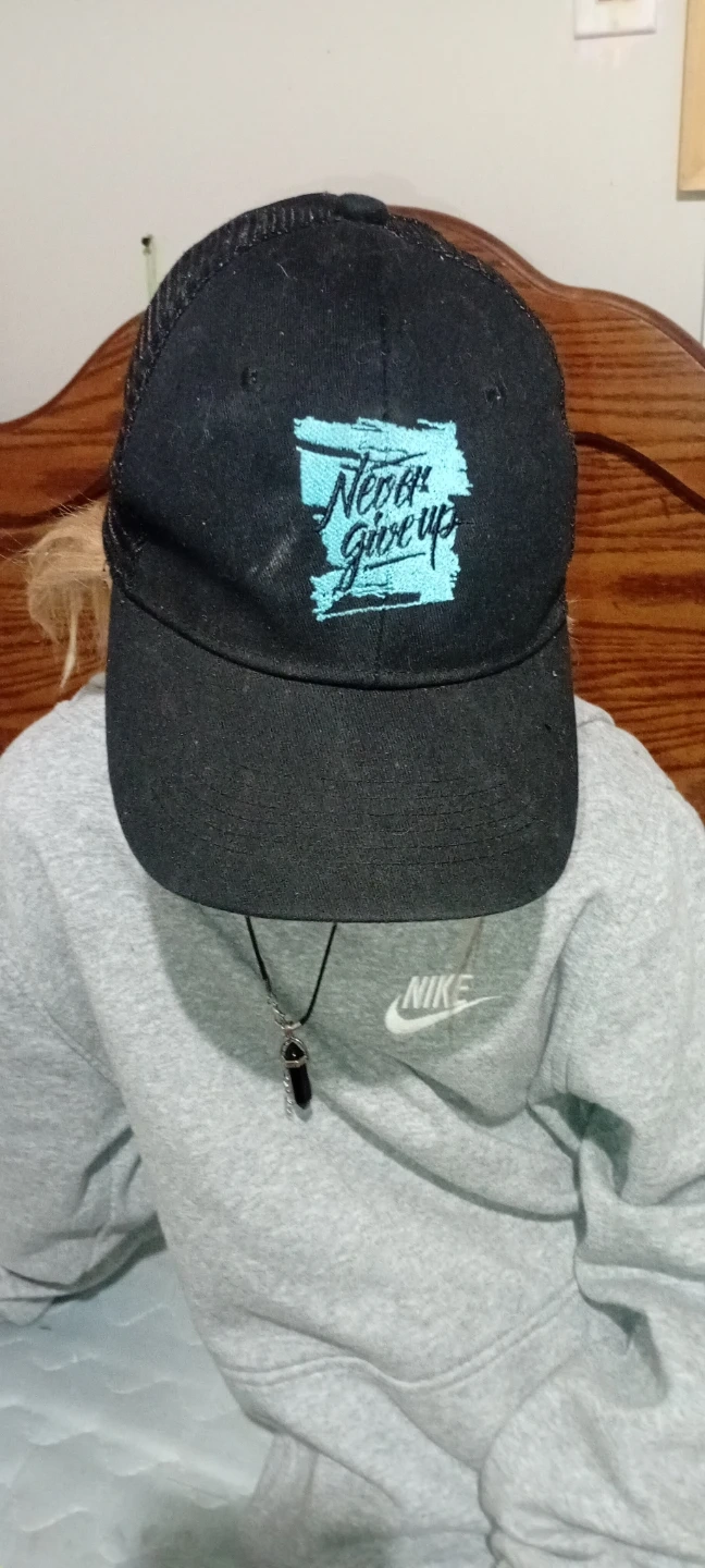 This black trucker hat has a mesh back and a "Never give up" graphic on the front. It's adjustable for a comfortable fit. Mesh back design.