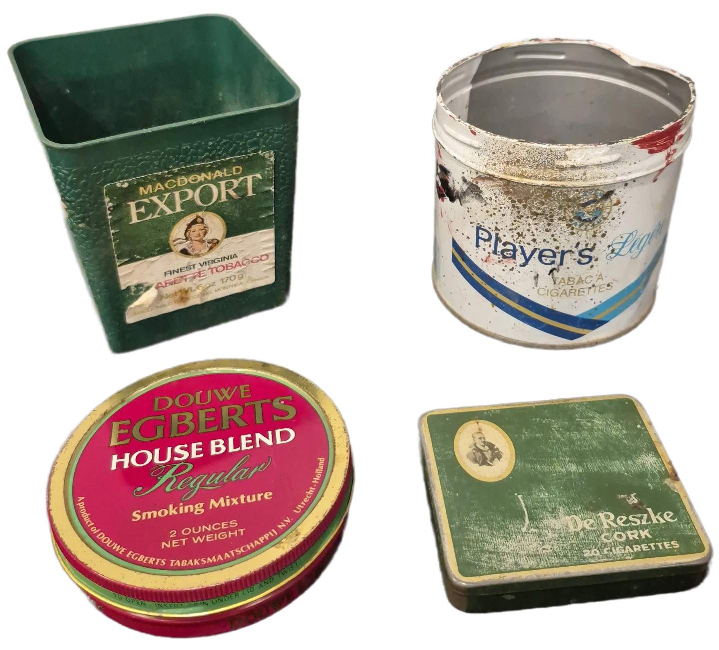 Collection of vintage tobacco tins including Macdonald Export (170g), Douwe Egberts House Blend (2 oz), Player's, and De Reszke Cork (20 cigarettes). These tins are empty and show signs of age and use, making them great for display or collectors.