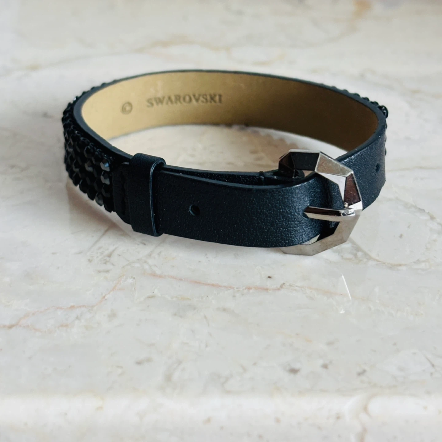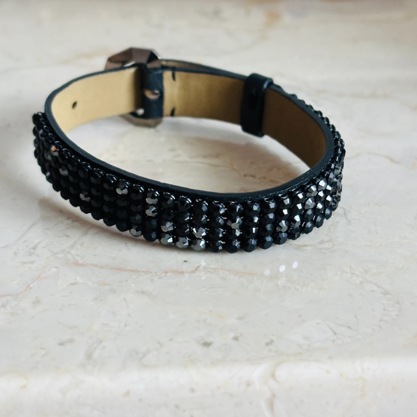 Selling a cute Swarovski bracelet! It features black leather and sparkly black crystals. The buckle is a shiny gun metal silver colour. Adjustable from 6-7-8 inches.