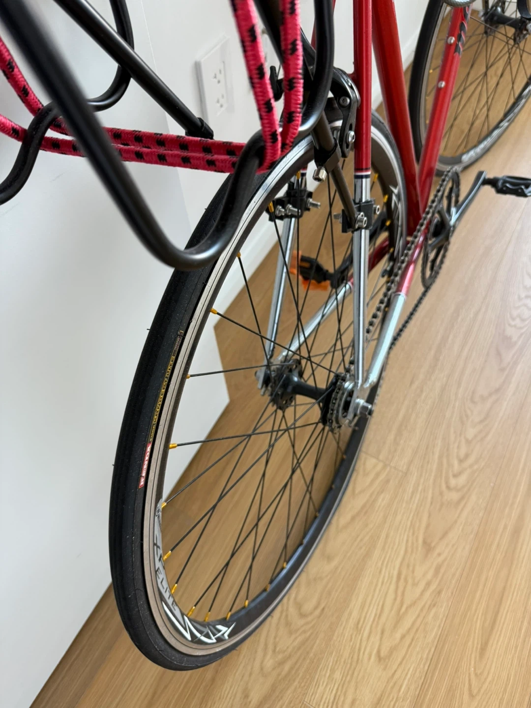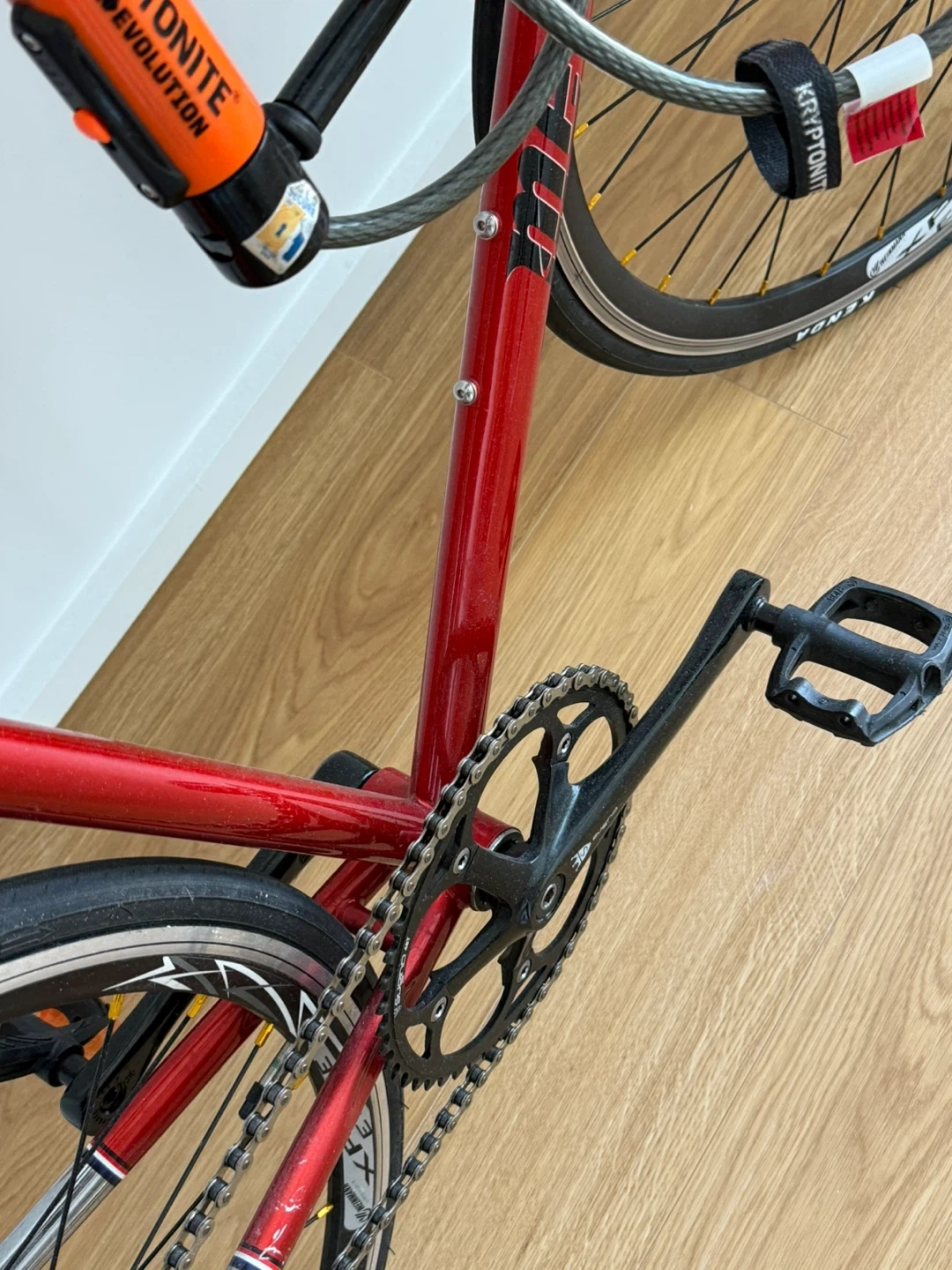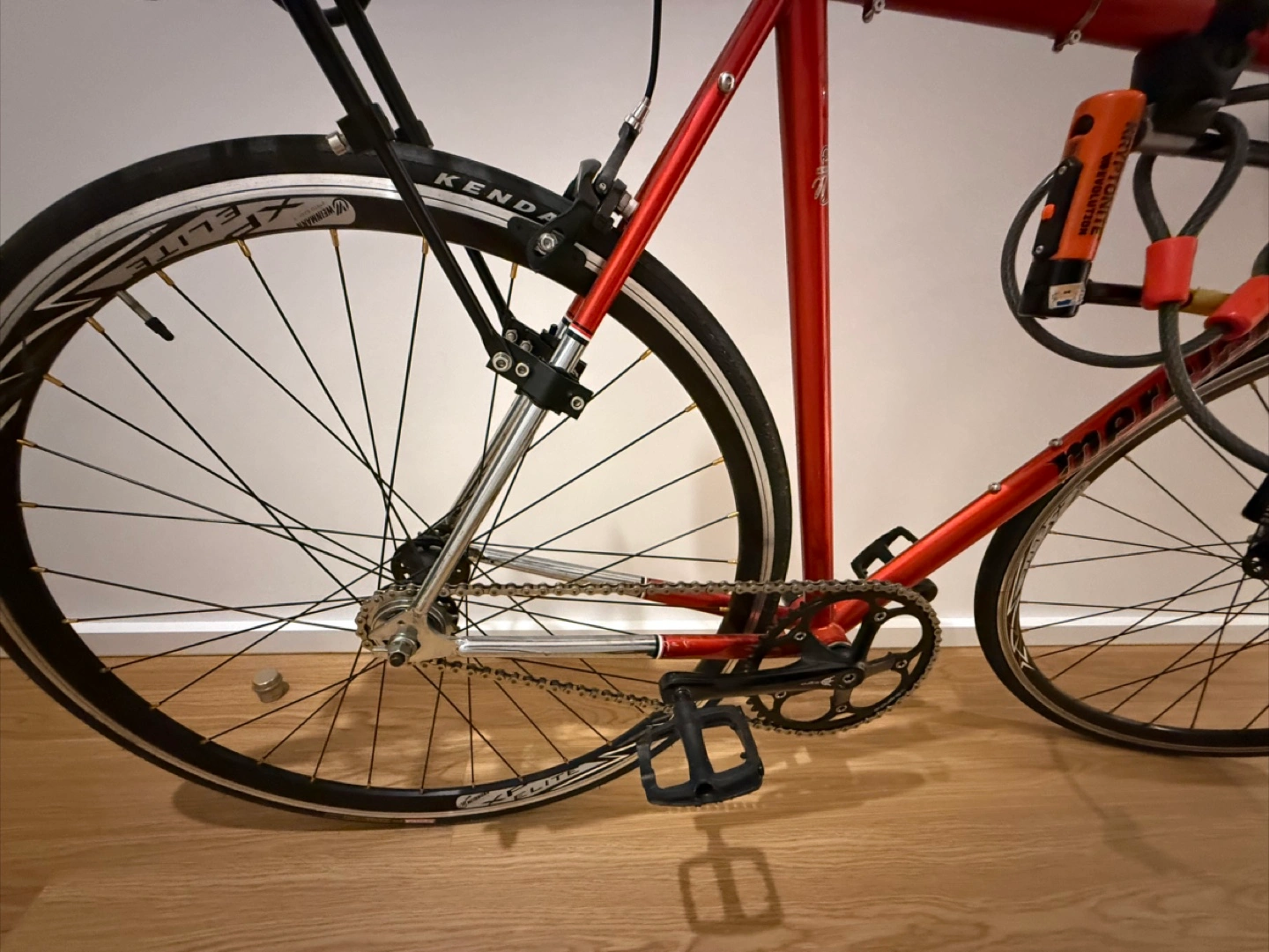 Selling a Mercier fixed gear road bike in red. It's equipped with Kenda tires and has a rear rack and lights installed. And the locked added