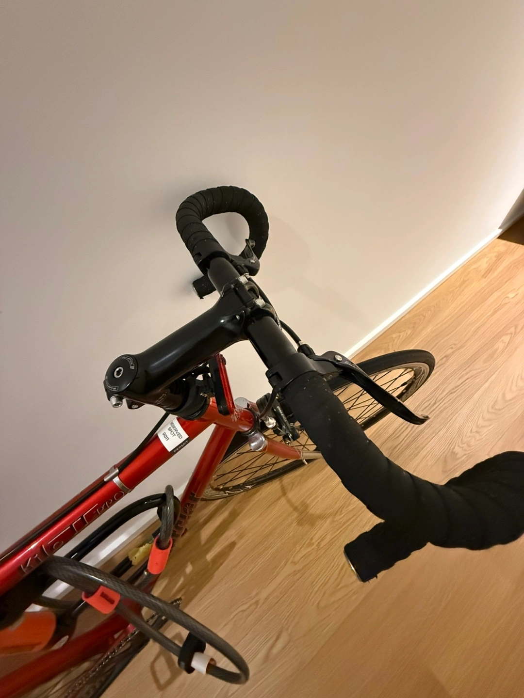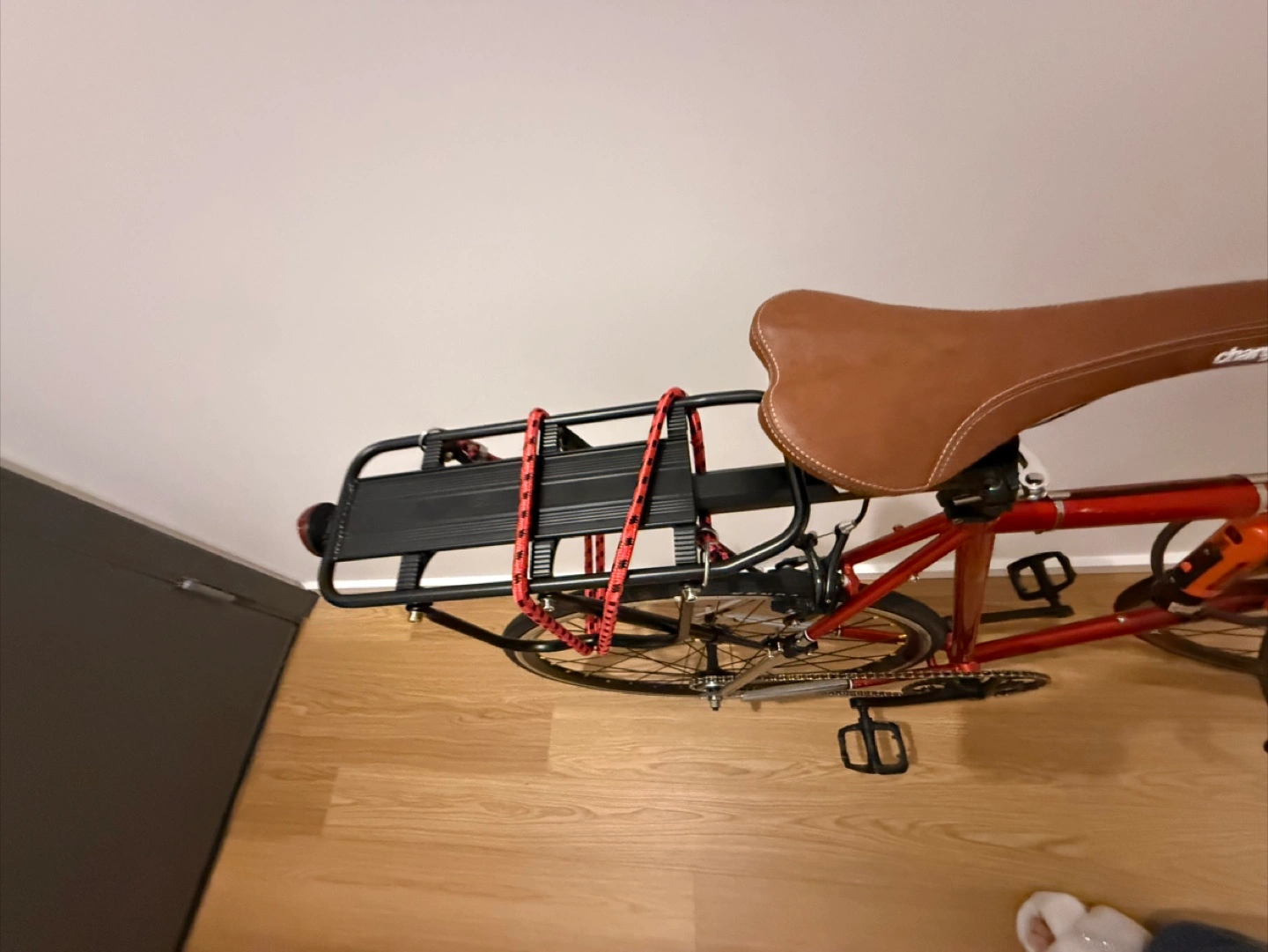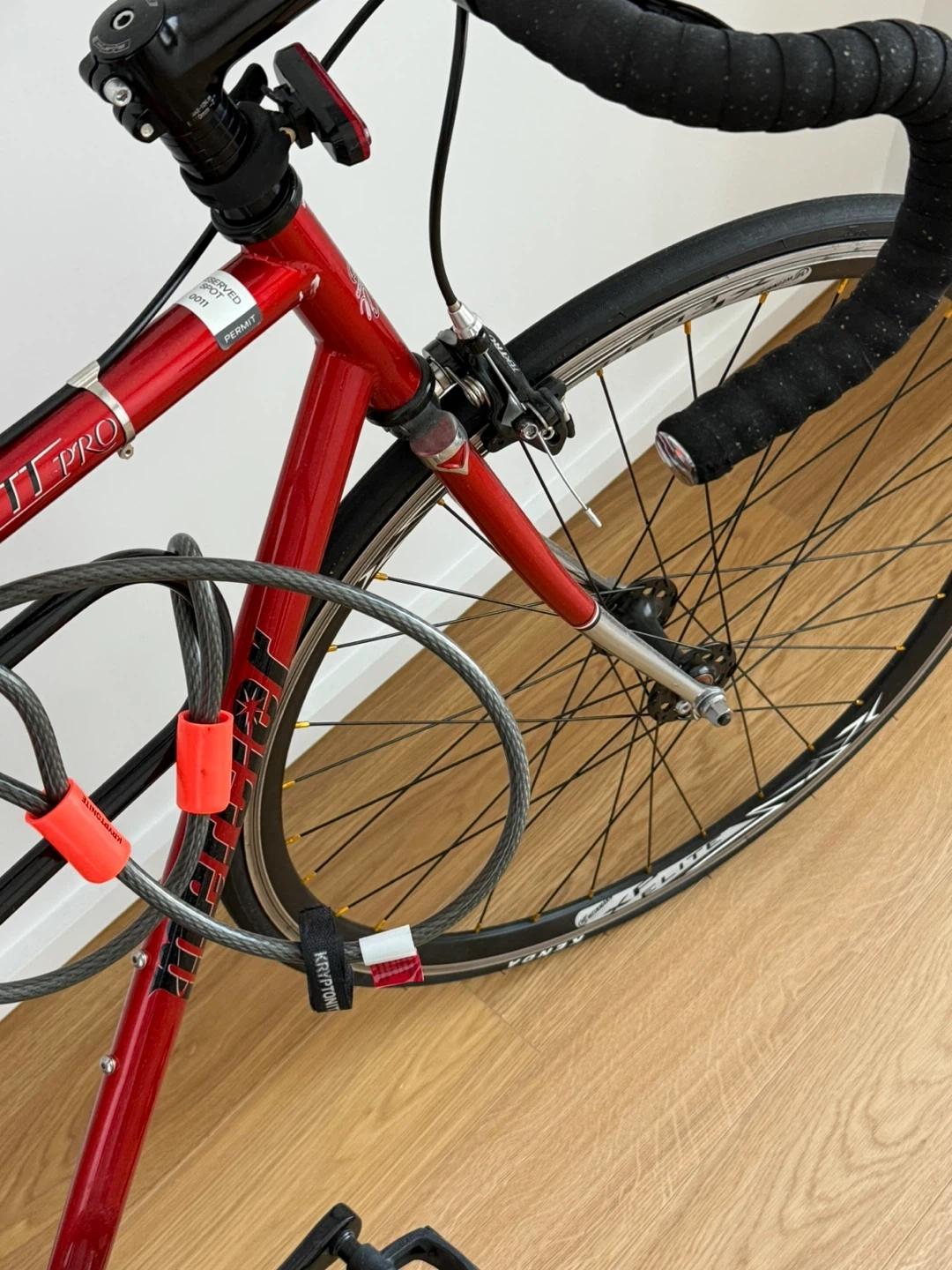 Selling a Mercier fixed gear road bike in red. It's equipped with Kenda tires and has a rear rack and lights installed. And the locked added