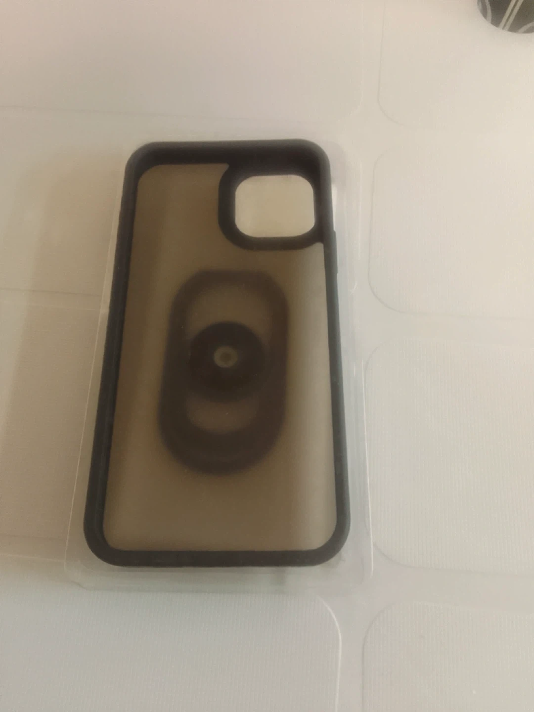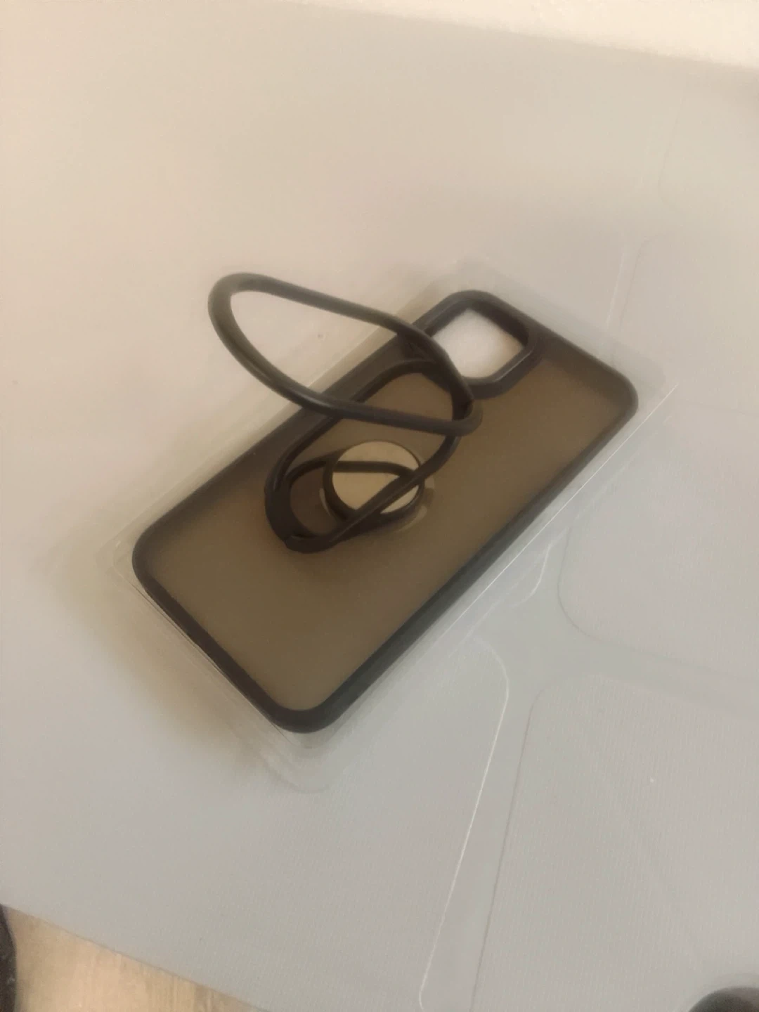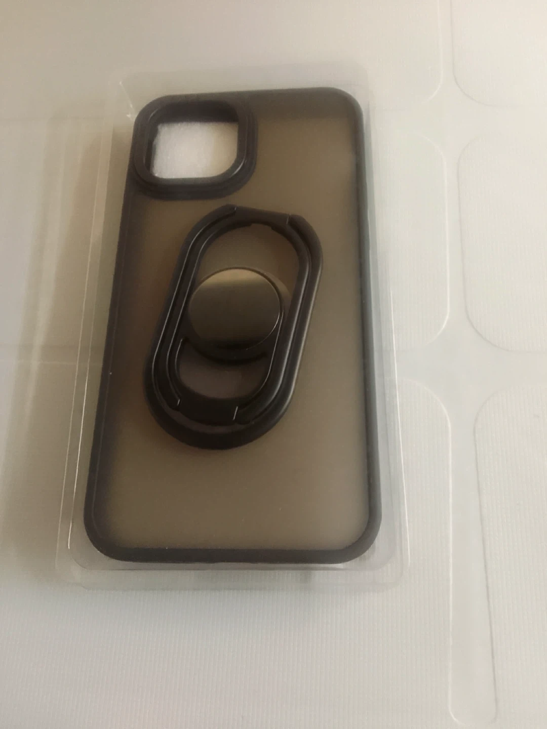 Smoky grey phone case with a built-in ring holder. It's made of a durable, transparent material with a black frame. The ring can rotate for comfortable viewing and grip.