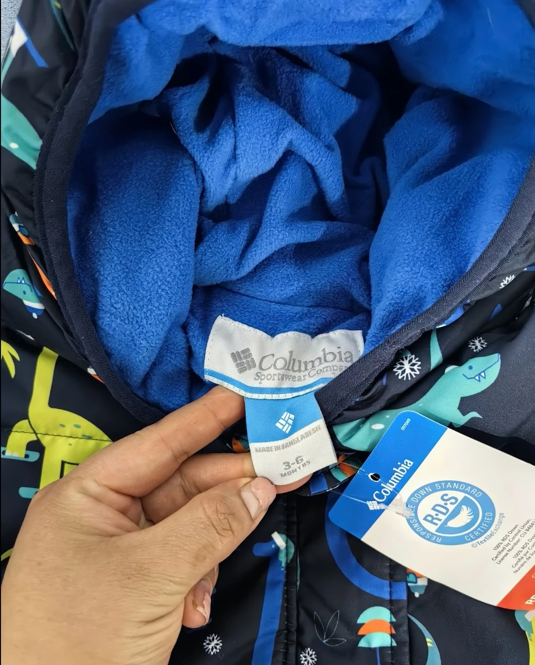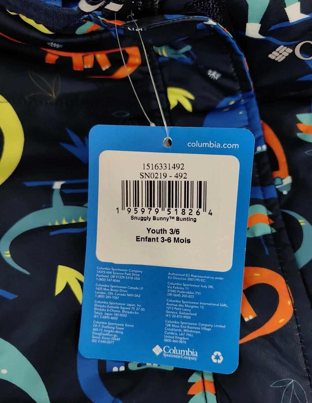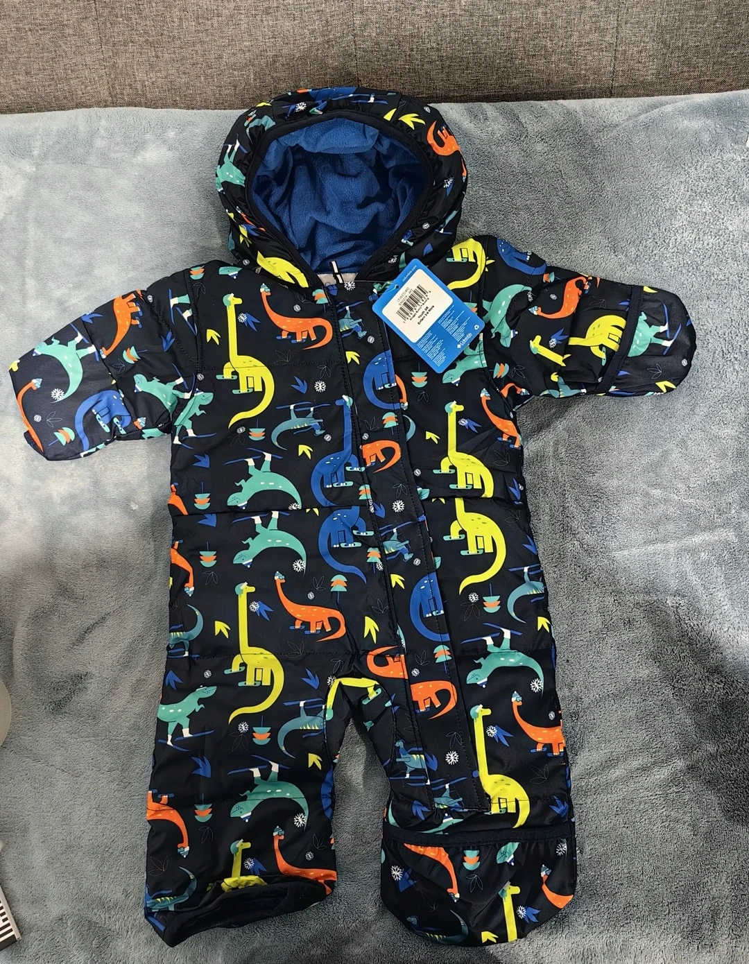 This is a brand new Columbia Snowsuit for youth, size 3-6 months! The bunting features a fun dinosaur pattern and is perfect for keeping your little one warm and cozy.