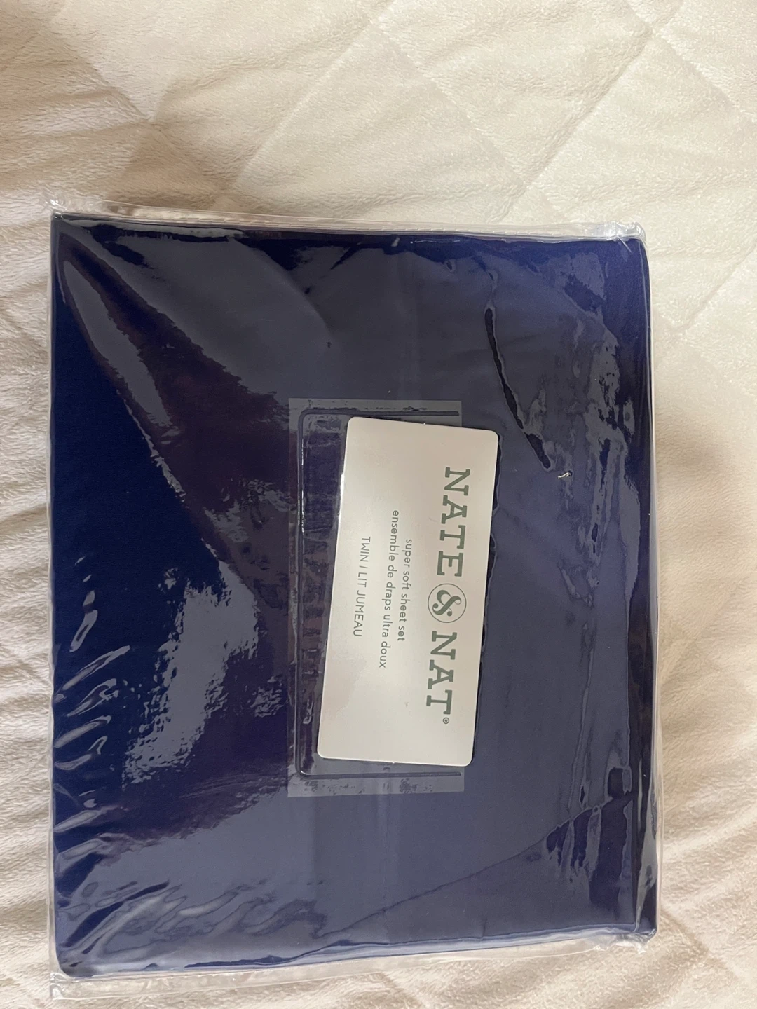Nate & Nat twin sheet set in a deep navy blue. It's made of 100% polyester for a super soft feel. Includes one flat sheet, one fitted sheet with a deep contour, and one standard pillowcase.