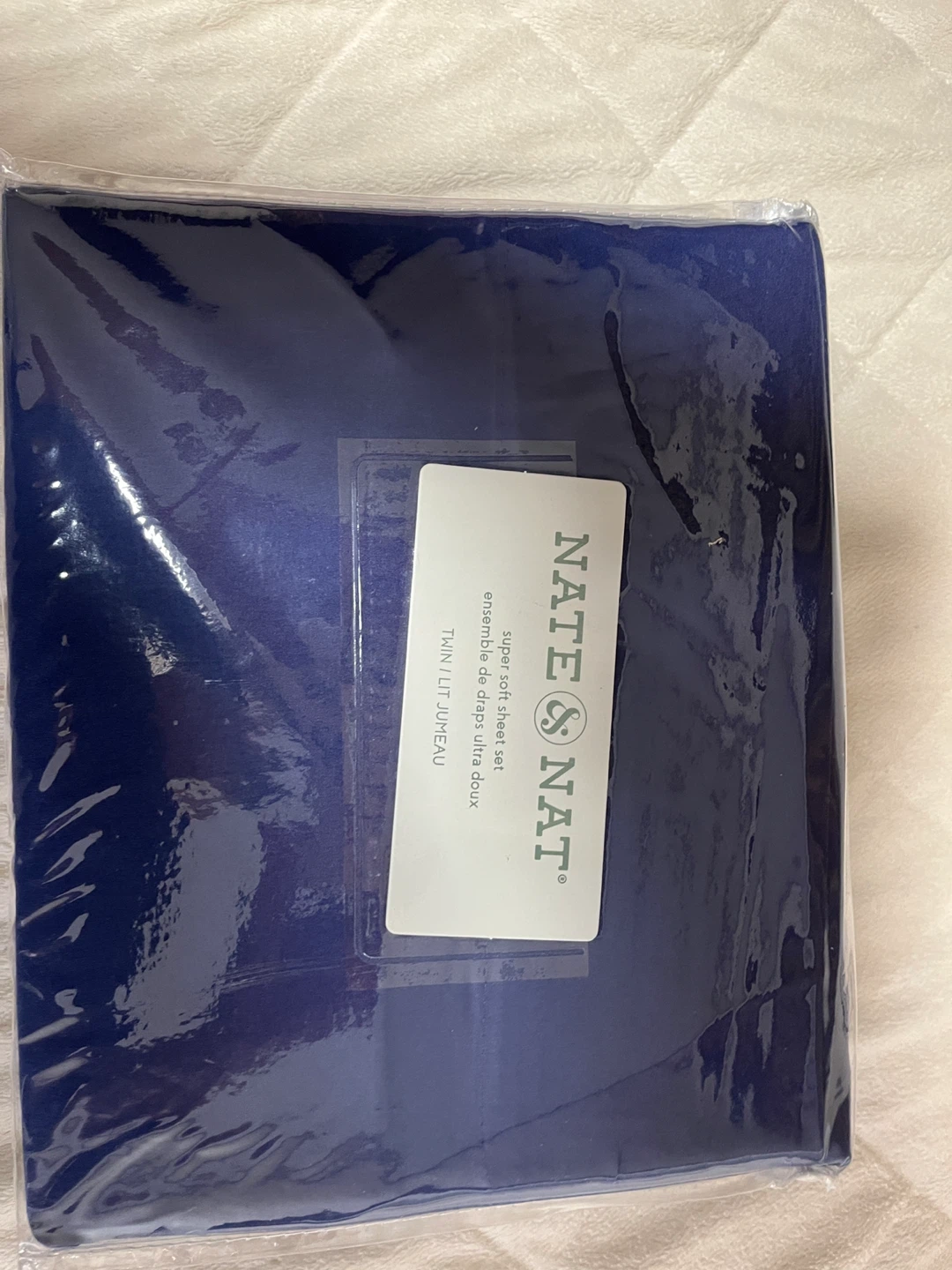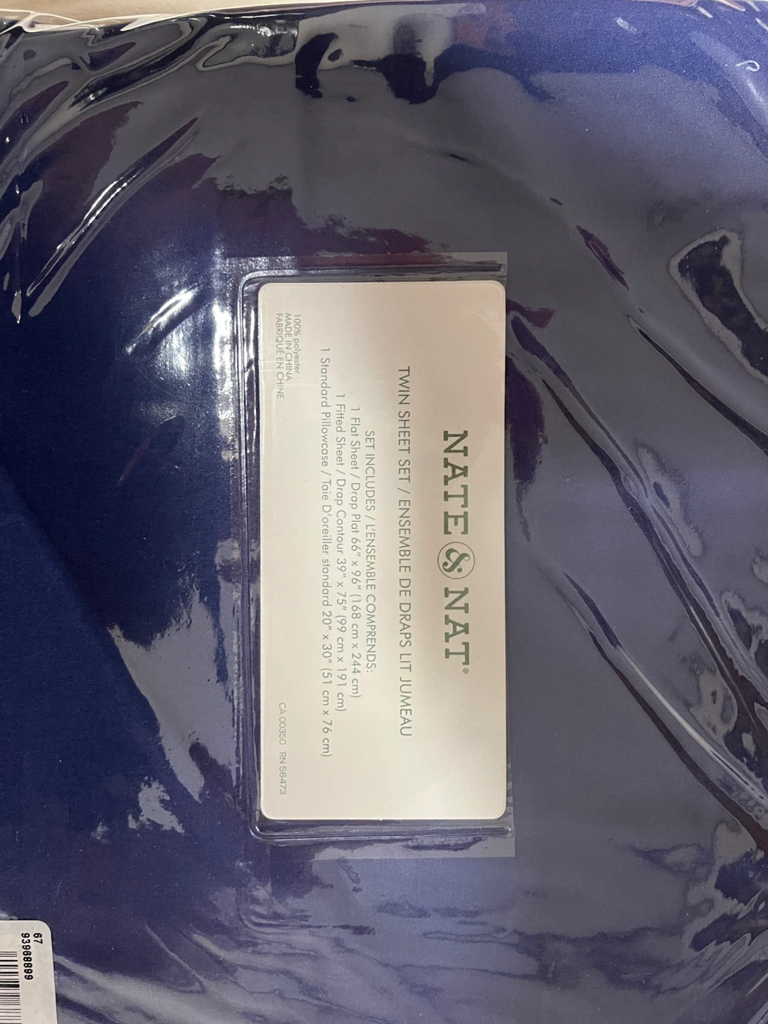 Nate & Nat twin sheet set in a deep navy blue. It's made of 100% polyester for a super soft feel. Includes one flat sheet, one fitted sheet with a deep contour, and one standard pillowcase.