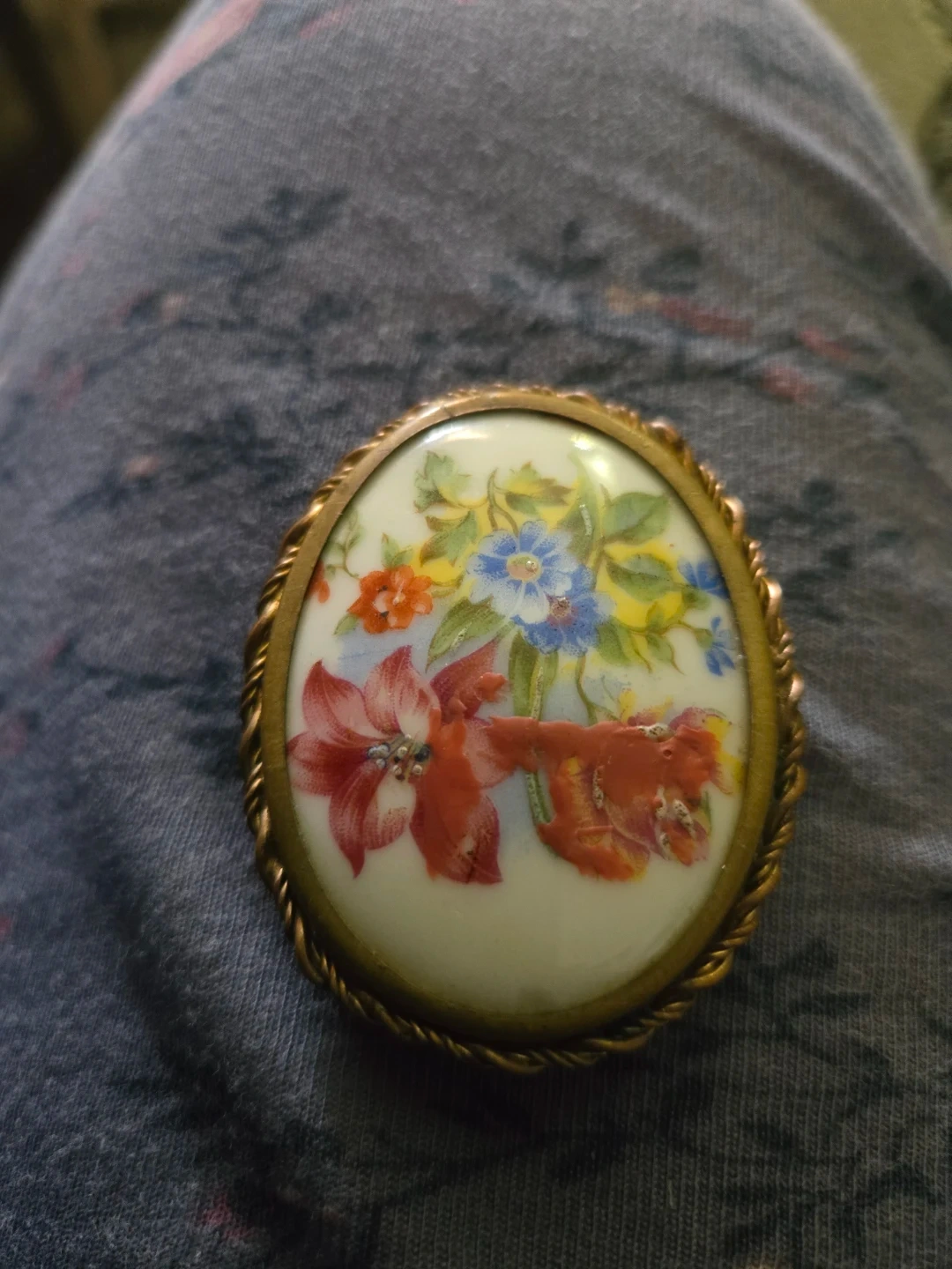 This is a beautiful vintage Limoges porcelain brooch from France. It features a delicate floral design with vibrant colours. It's a lovely accent piece for any outfit!