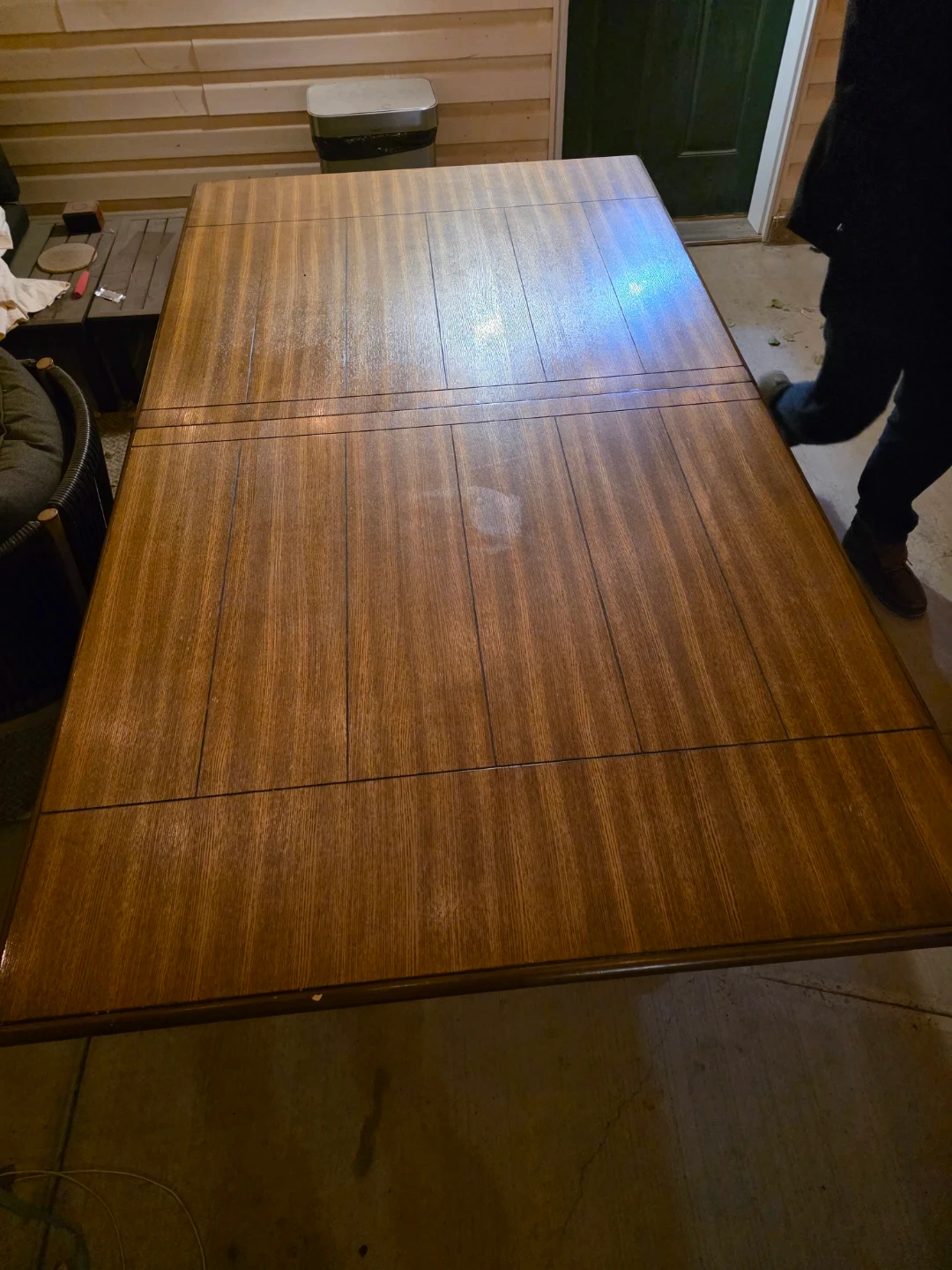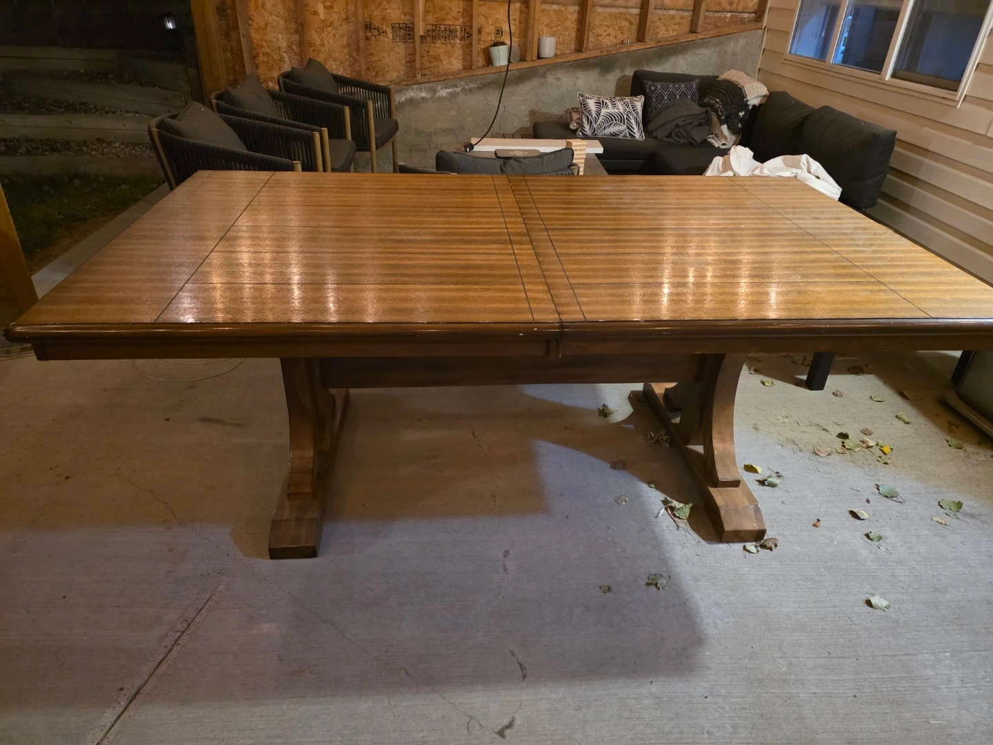 Selling a wooden dining table. It's in good condition and would be a great addition to any home. The table has a beautiful finish and a sturdy base. Perfect for family dinners or entertaining friends. Table extends with an extra leaf in the middle.