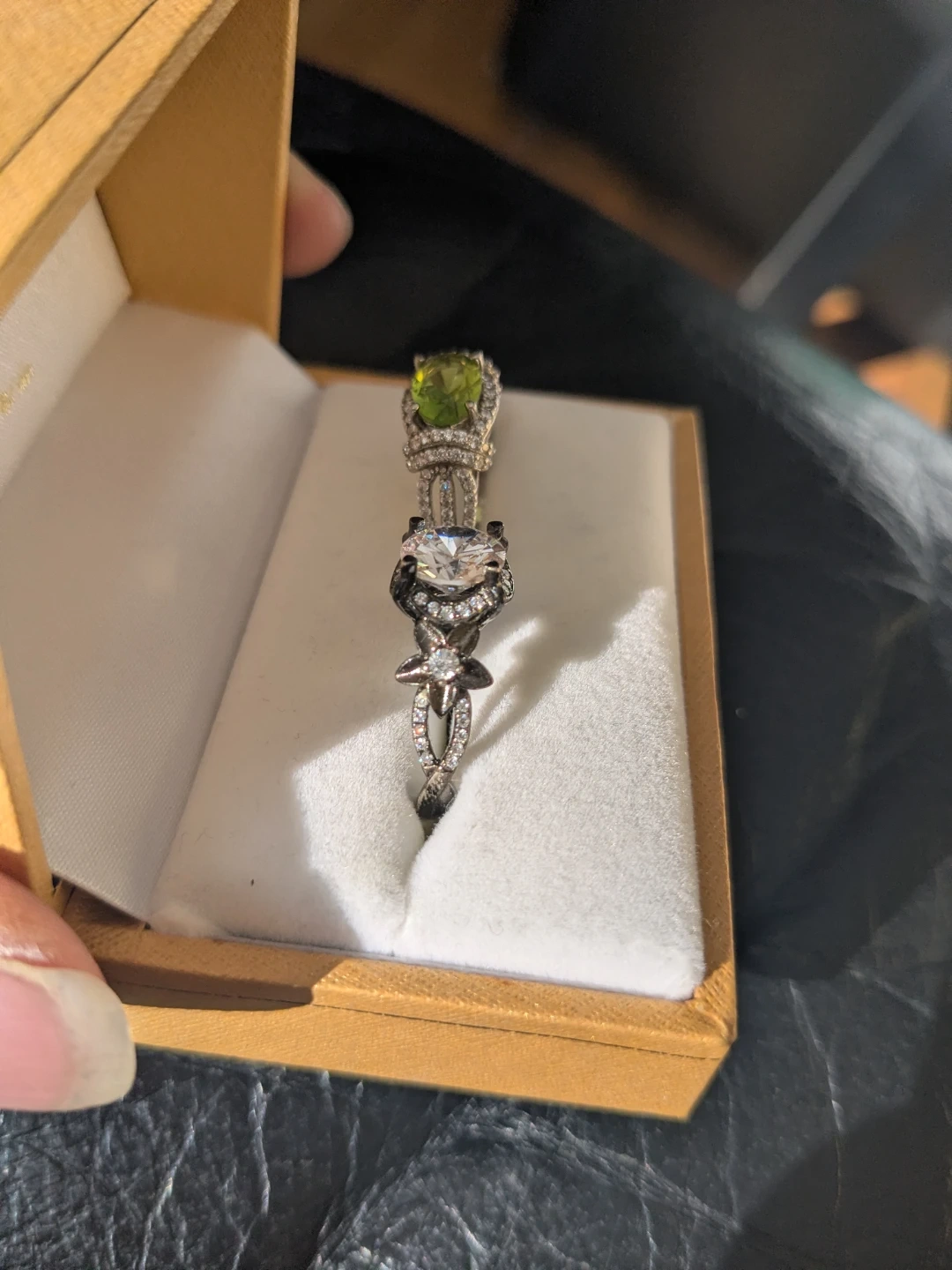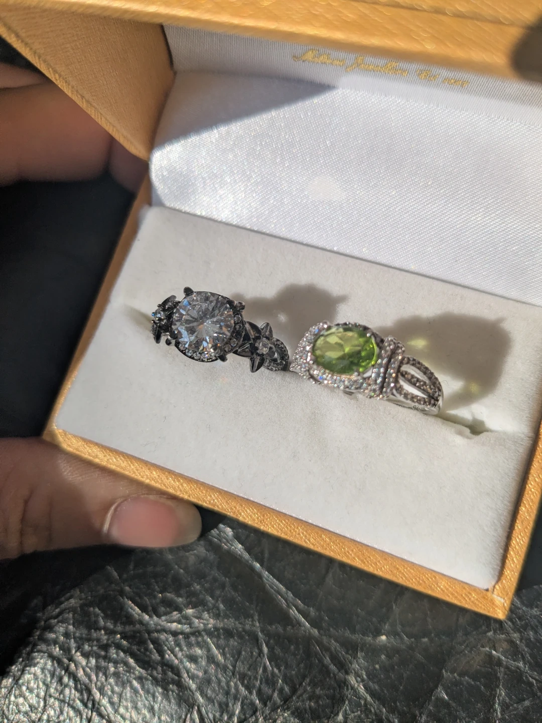 Note artificial stones** price includes both pieces. Beautiful ring set featuring a green peridot and a sparkling white stone. This set includes two rings, perfect for adding a touch of elegance. Dark chrome ring missing two tiny stones around border of large stone. The craftsmanship is detailed, making it a lovely addition to any jewelry collection.