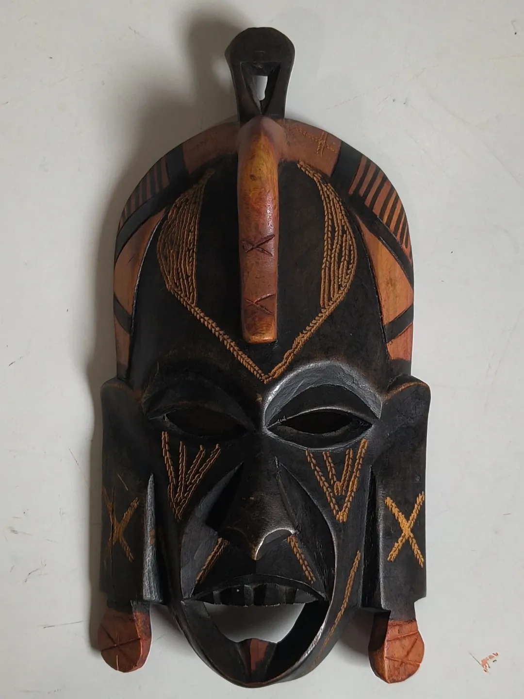 This is a striking hand-carved wooden mask with traditional detailing. It features intricate carvings and a dark, rich finish. This piece would make a great decorative item.