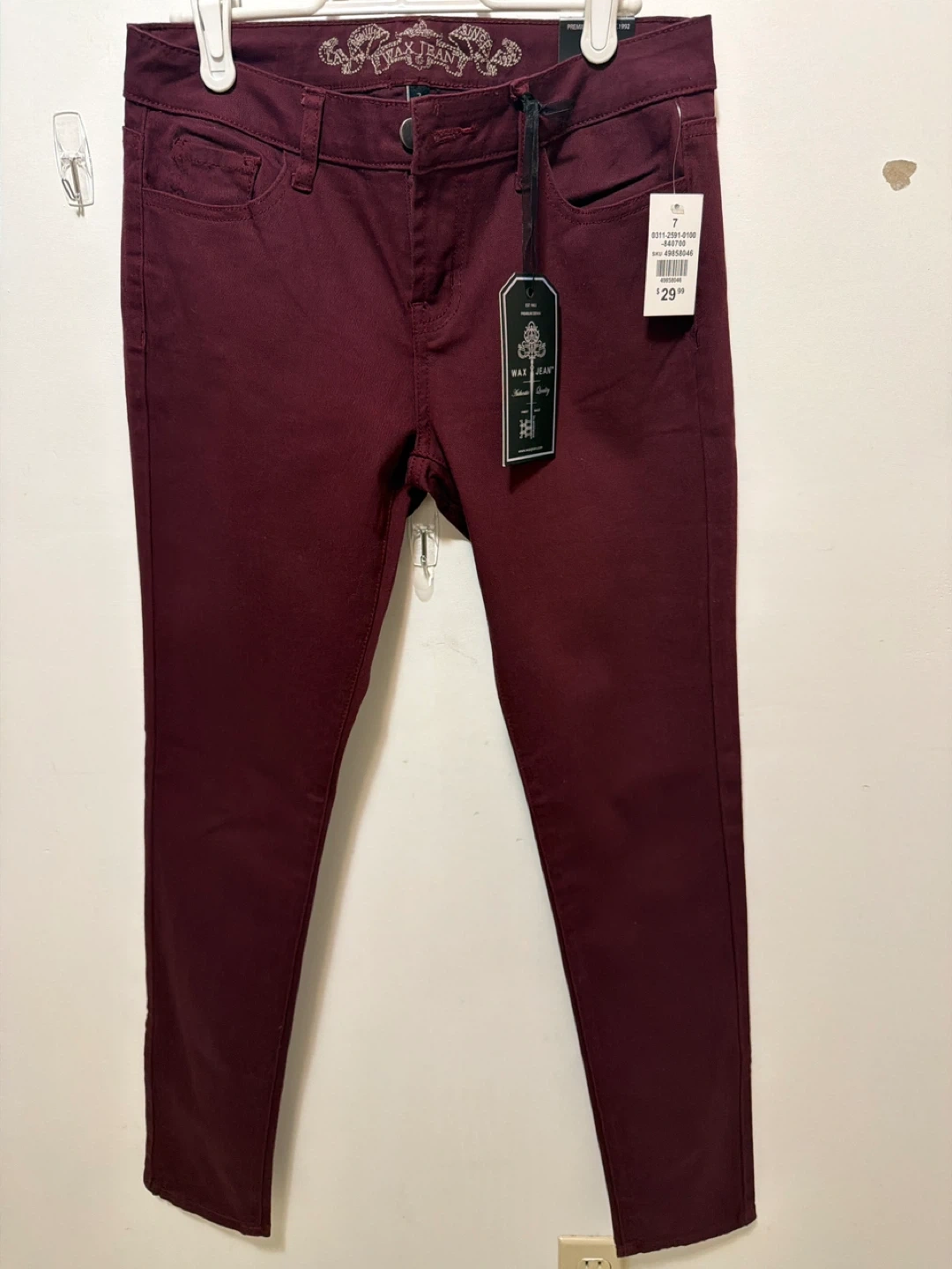 Selling a pair of Wax Jean pants in a lovely burgundy colour! They are a size 7 and made of 97% cotton, and 3% spandex. These jeans are in new condition and ready for a new owner