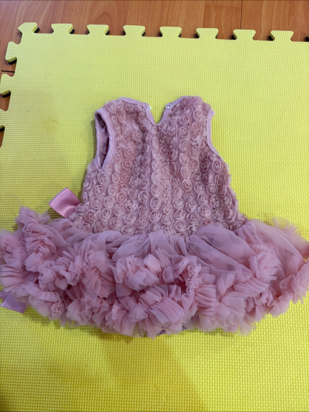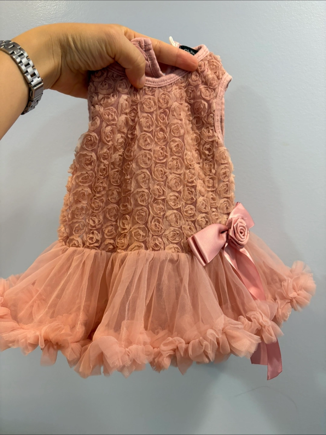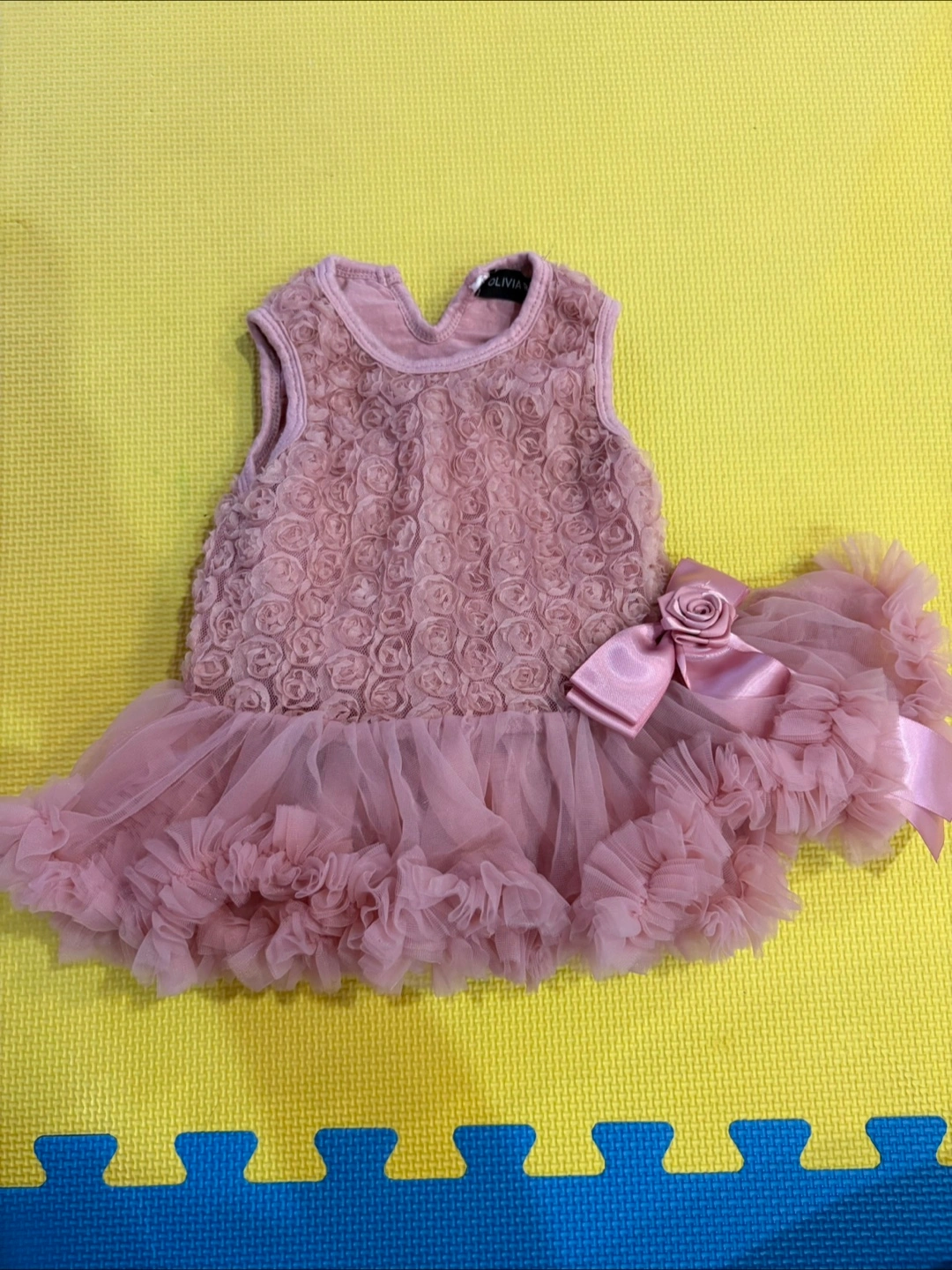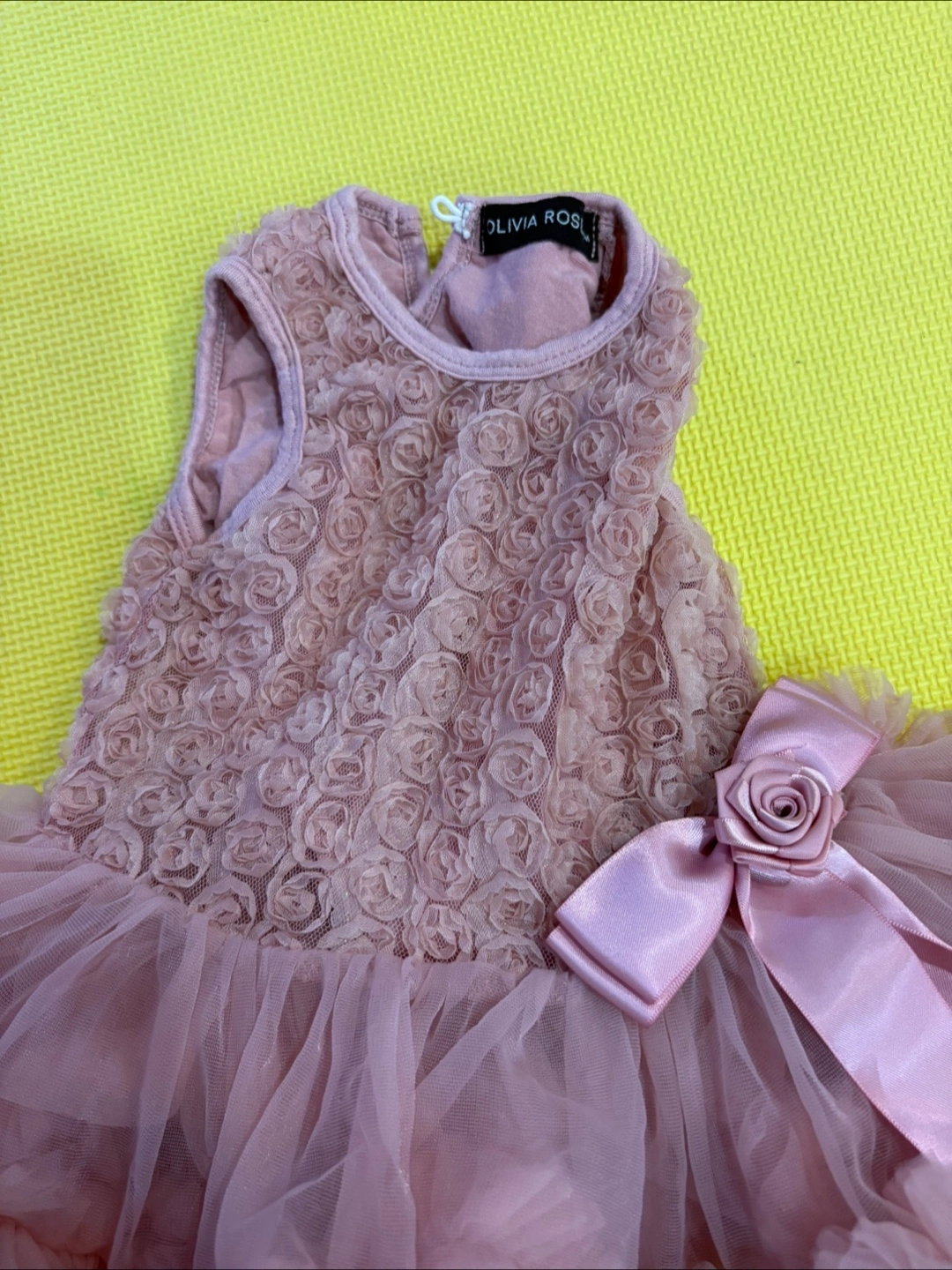 This adorable Olivia Rose dress is perfect for your little one! It's in great condition and comes in size 3-6 months. The dress is made of 75% cotton and 25% nylon chiffon, making it soft and comfortable for your baby. It features a beautiful rose design on the bodice and a tulle skirt. Hand wash cold, no bleach, hang dry, and keep away from fire