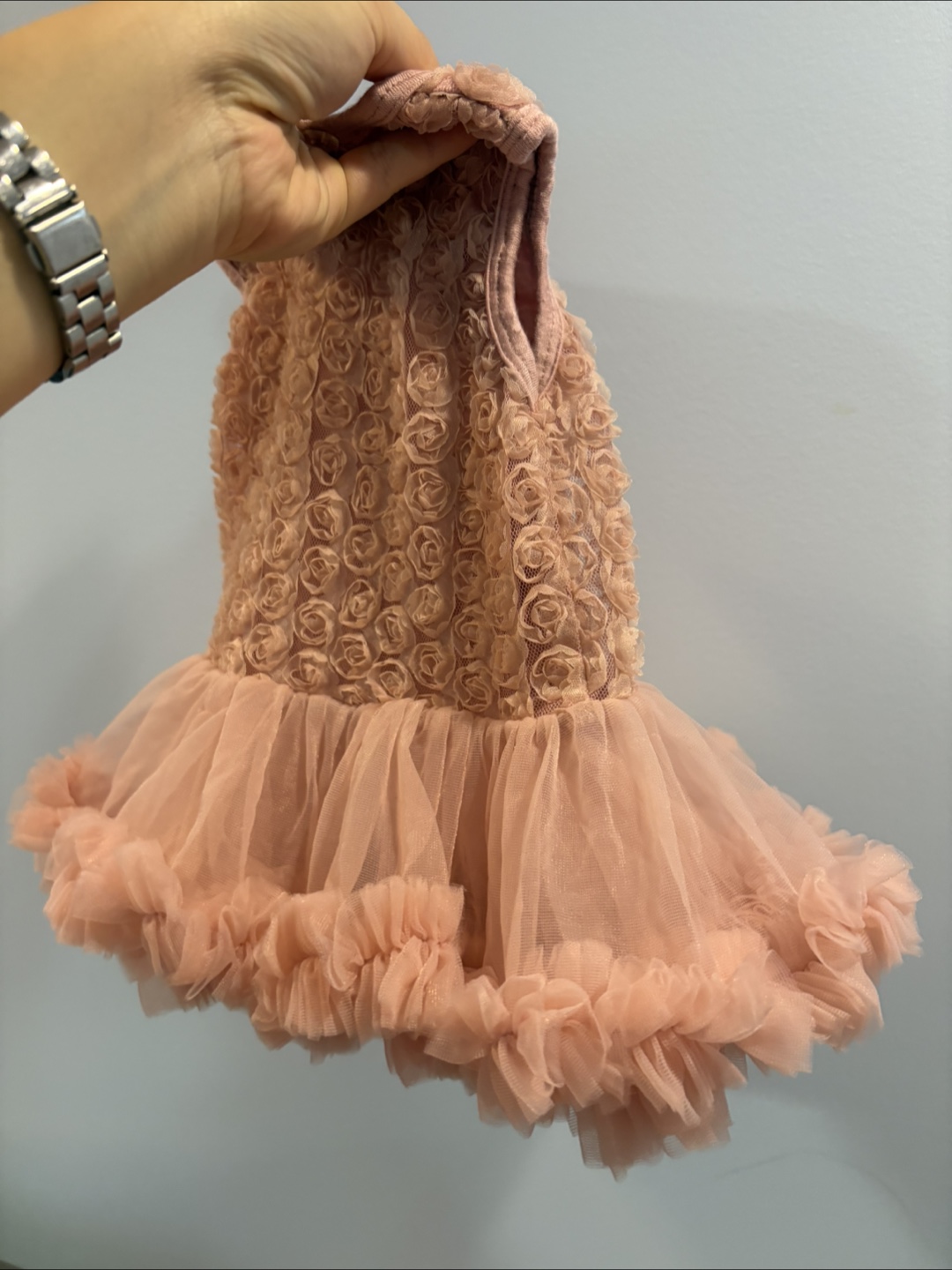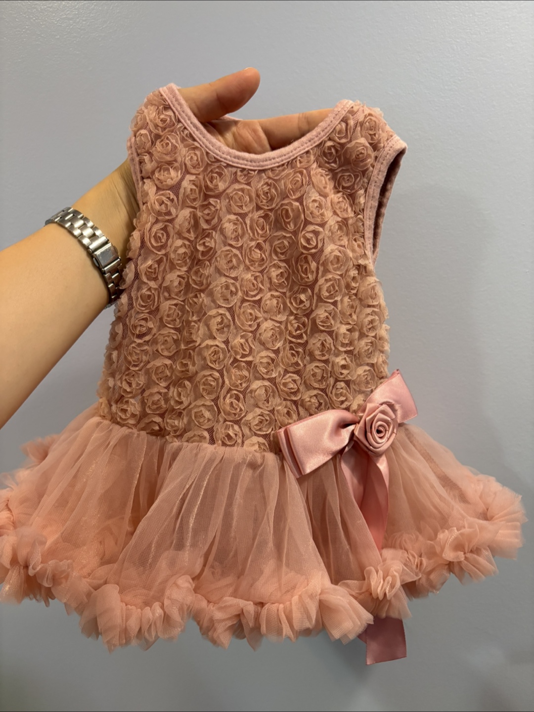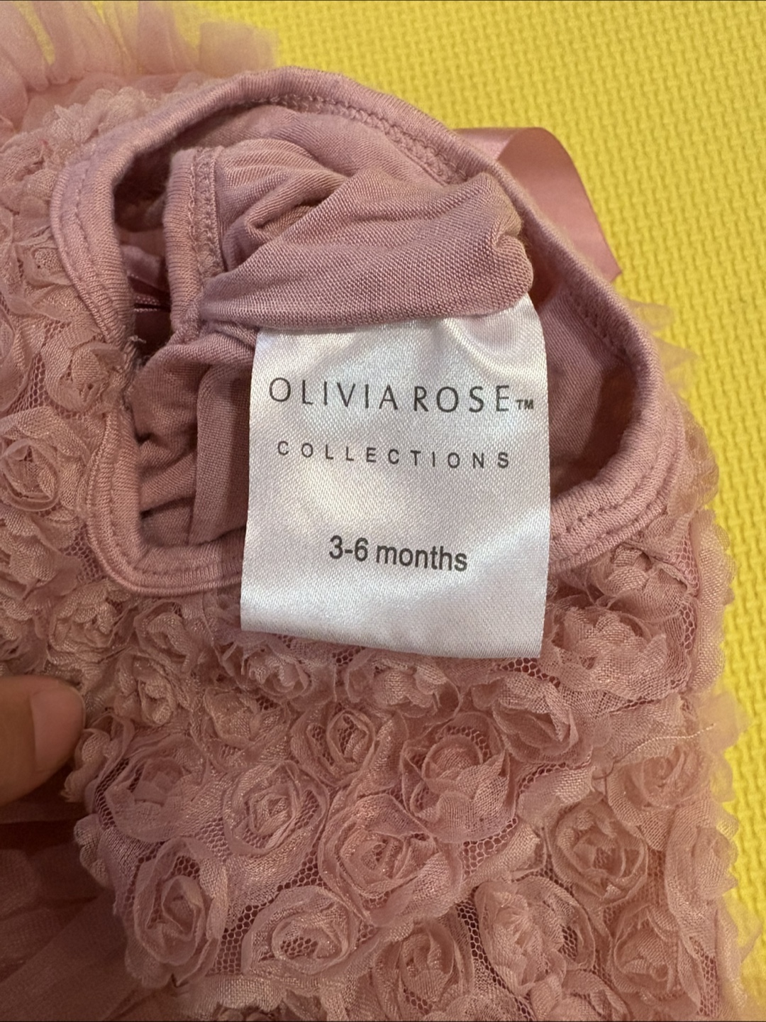 This adorable Olivia Rose dress is perfect for your little one! It's in great condition and comes in size 3-6 months. The dress is made of 75% cotton and 25% nylon chiffon, making it soft and comfortable for your baby. It features a beautiful rose design on the bodice and a tulle skirt. Hand wash cold, no bleach, hang dry, and keep away from fire