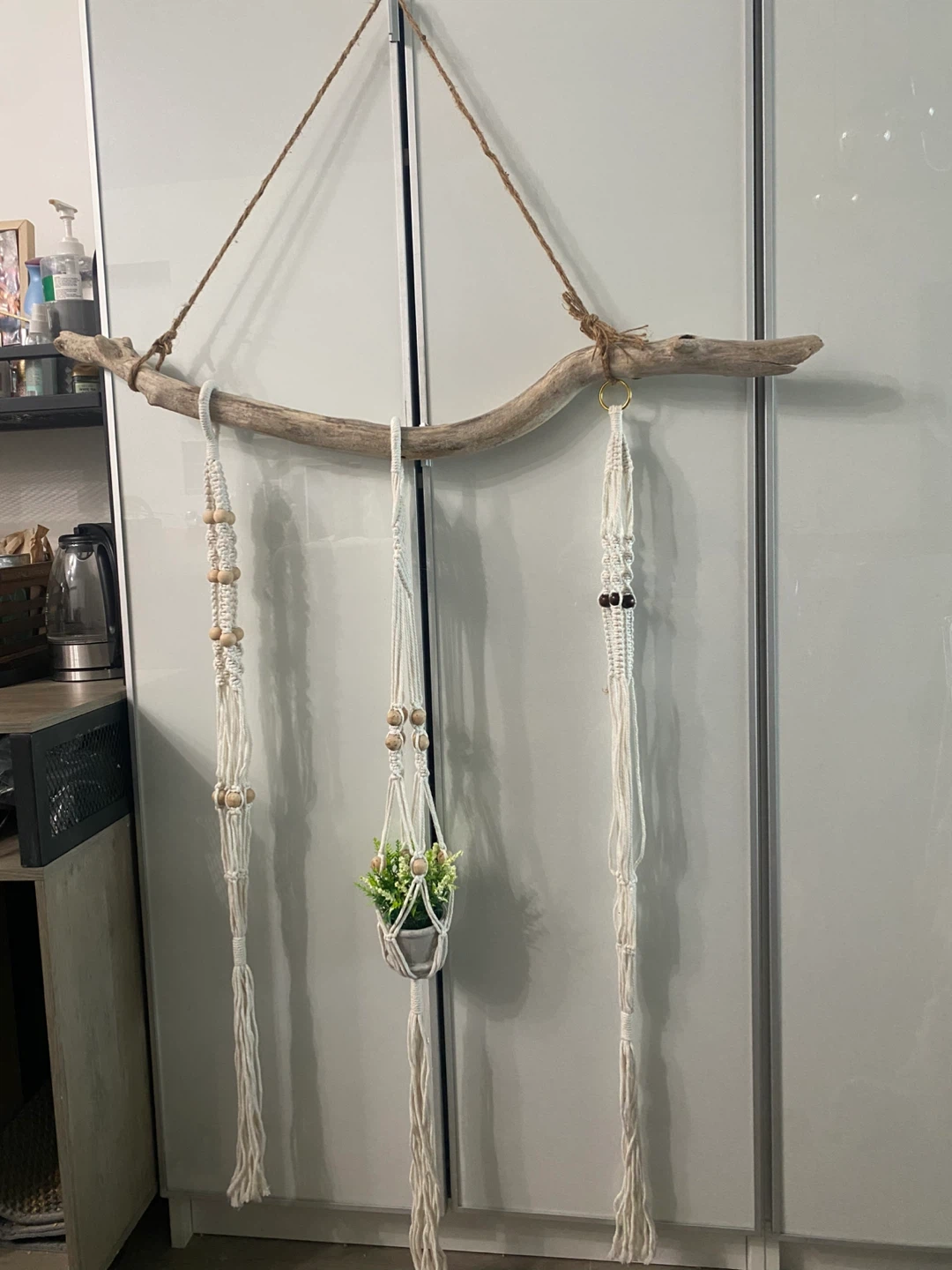 Handmade macrame plant hanger mounted on a natural driftwood branch. It features three individual hangers adorned with wooden beads. Perfect for adding a bohemian touch to your home decor!