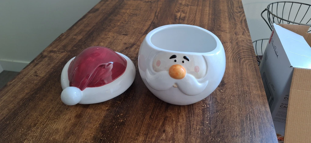 Here's a cute Santa cookie jar with a lid! It's perfect for holiday baking and decorating. The jar is in great condition and ready to hold your favourite treats