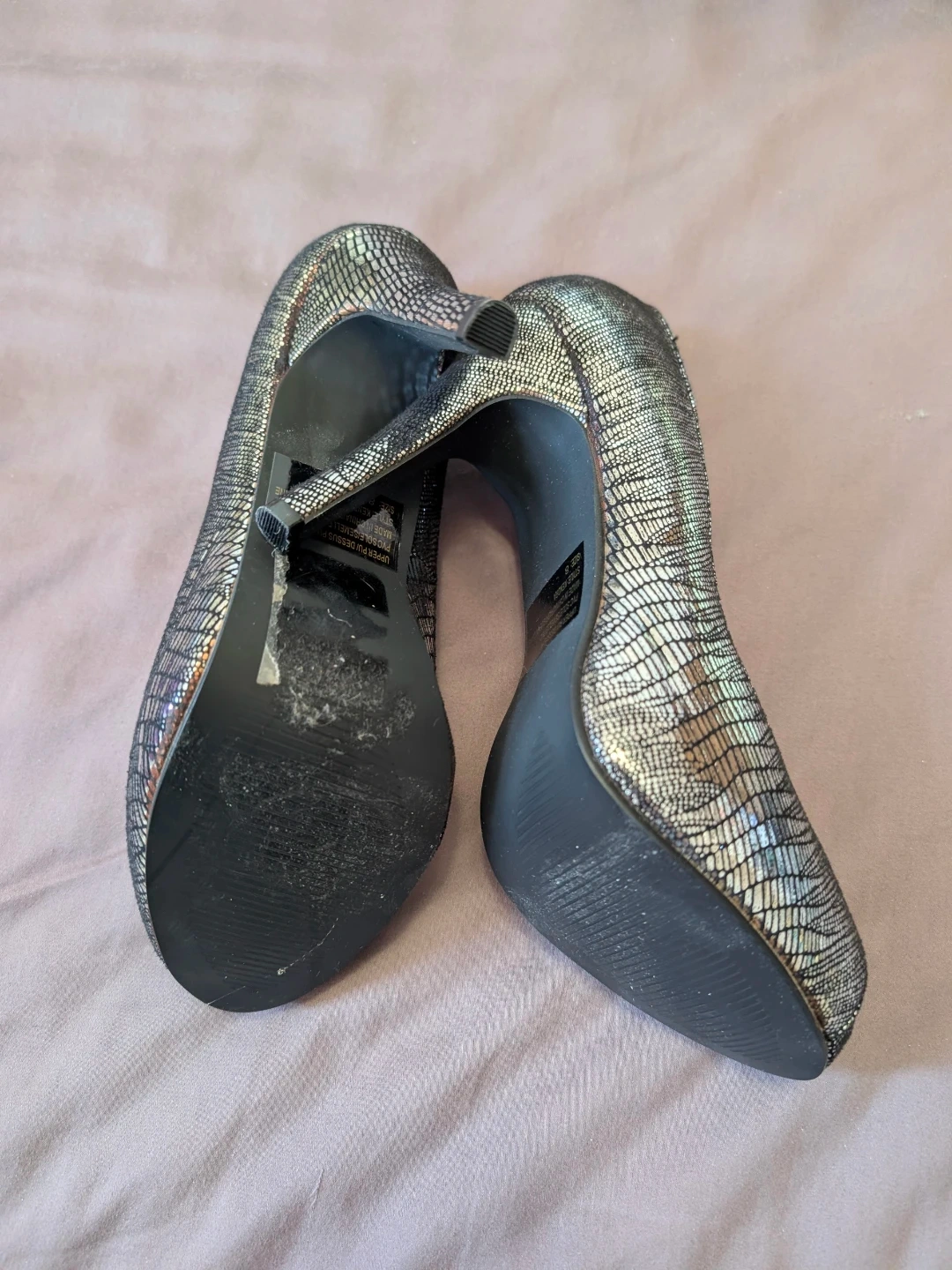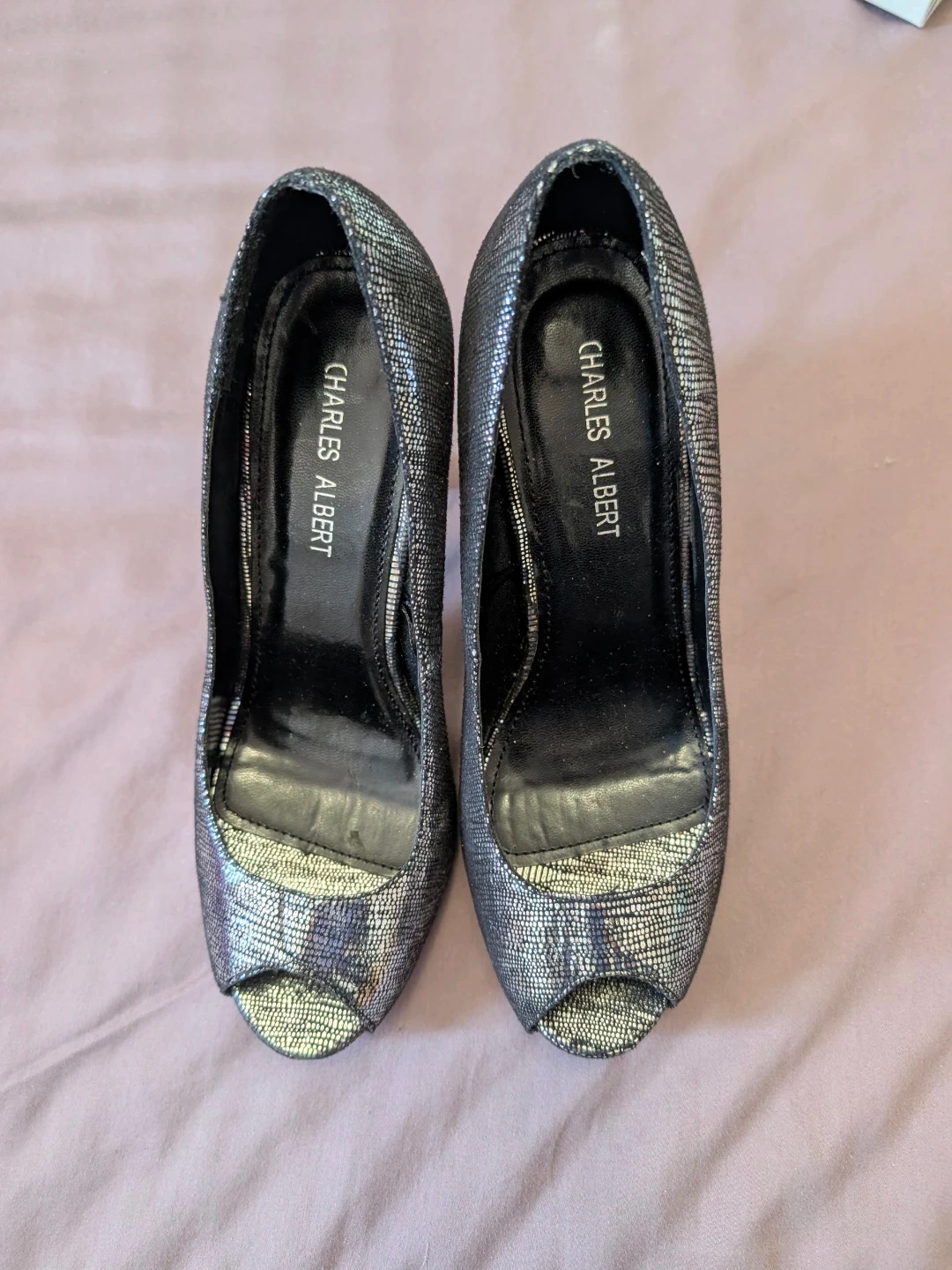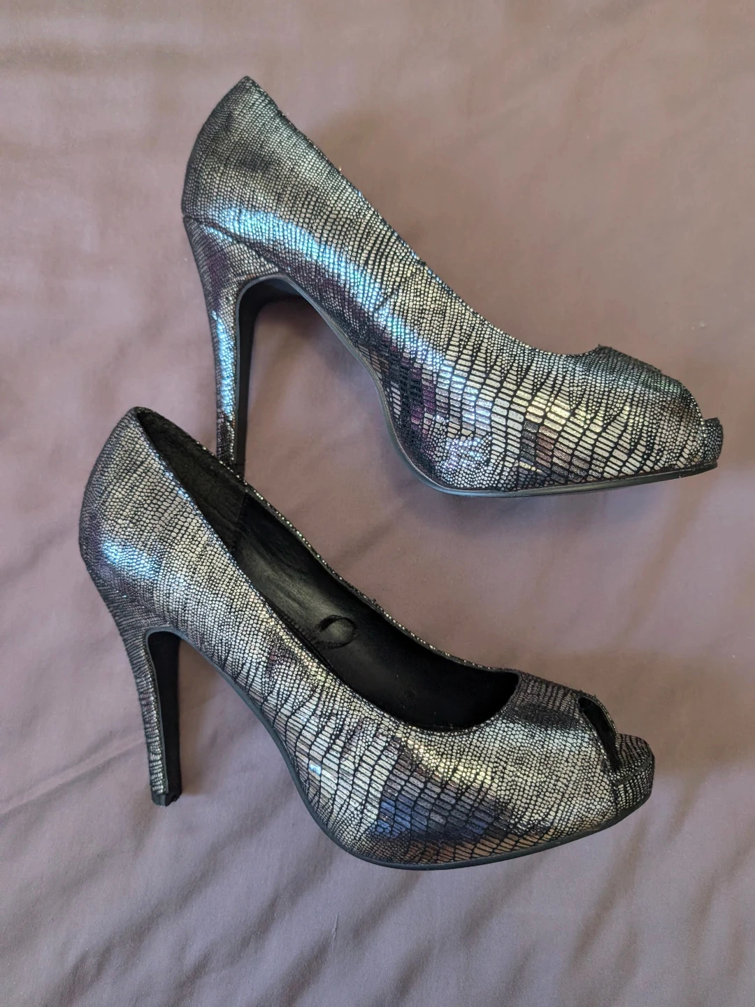 Charles Albert women's peep toe heels in a silver metallic finish. These heels feature a textured snake print design. They have a stylish stiletto heel.