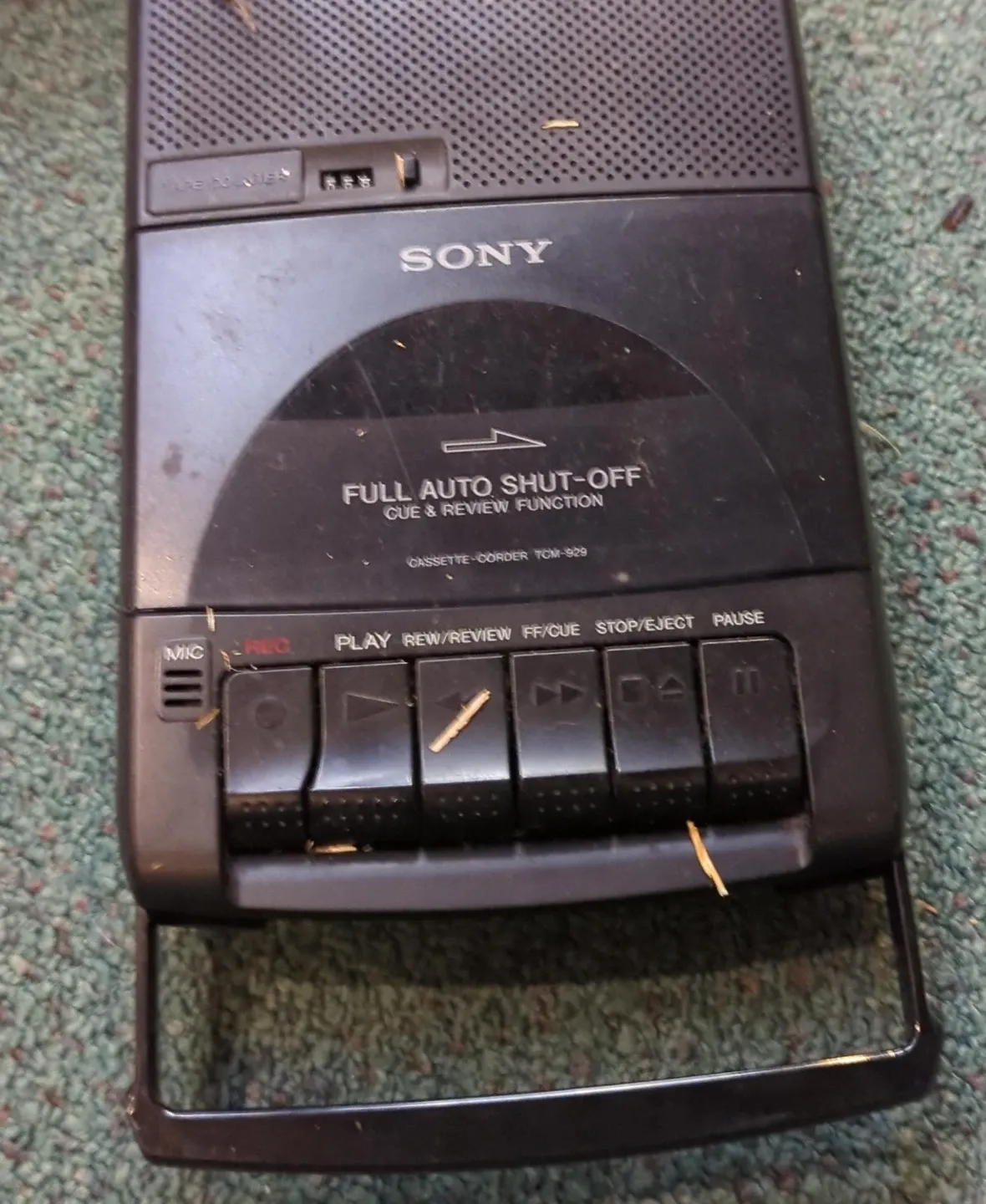 This is a Sony TCM-929 cassette-corder. It features a full auto shut-off and cue/review function. Includes play, rewind, fast forward, stop, and pause buttons.