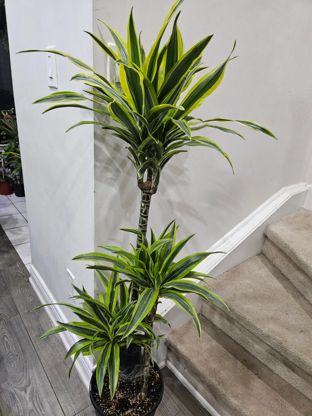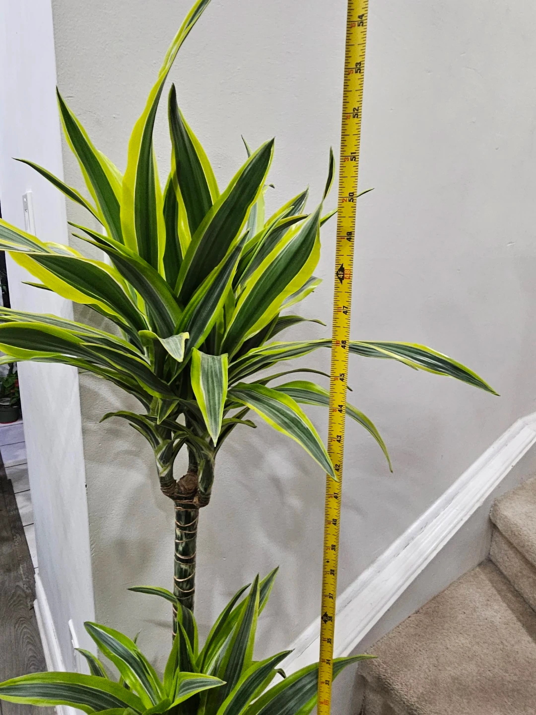 This Dracaena Fragrans 'Lemon Surprise' plant stands at approximately 48 inches tall. It features striking green and yellow variegated leaves on a braided trunk. This plant is easy to care for and brightens up any indoor space!