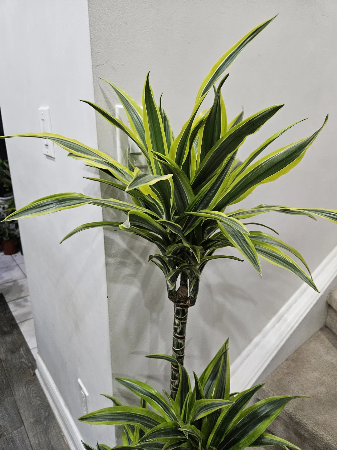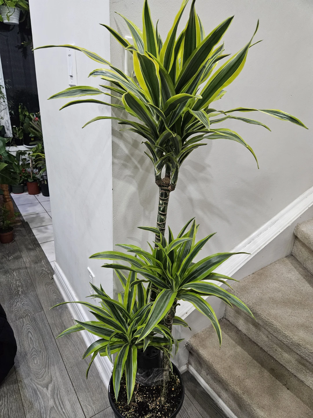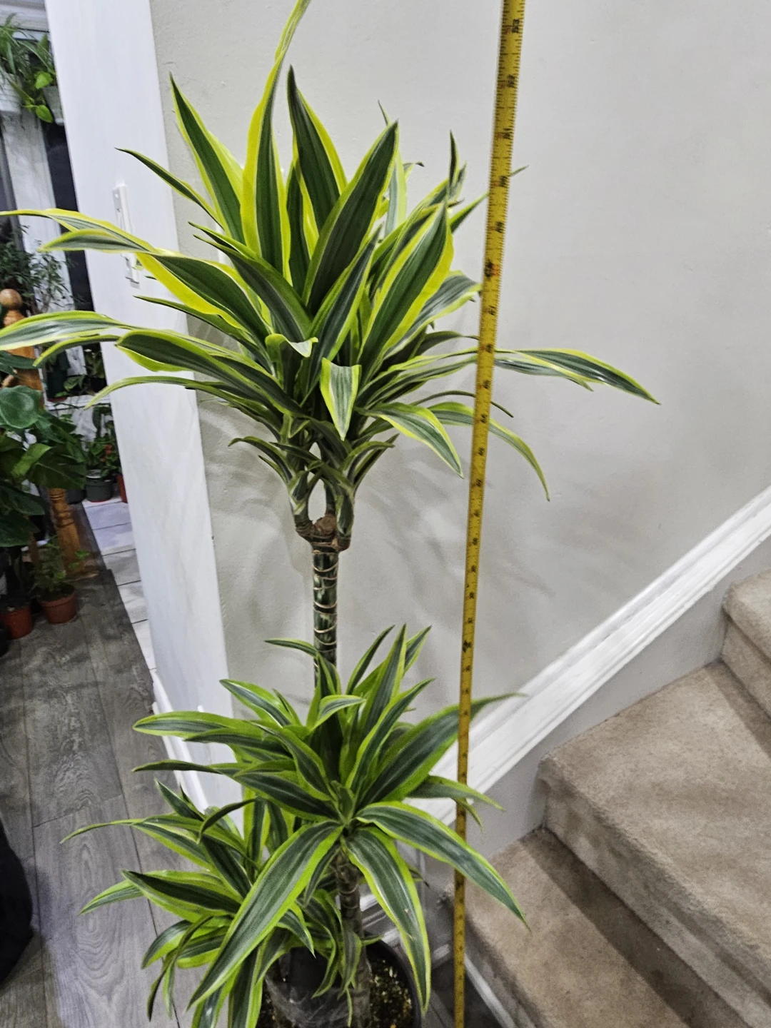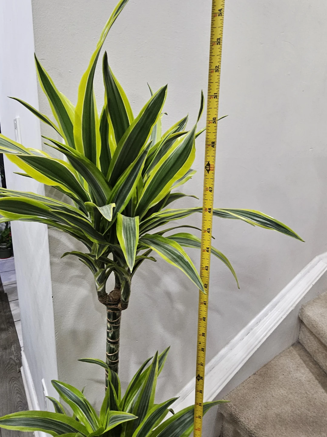 This Dracaena Fragrans 'Lemon Surprise' plant stands at approximately 48 inches tall. It features striking green and yellow variegated leaves on a braided trunk. This plant is easy to care for and brightens up any indoor space!