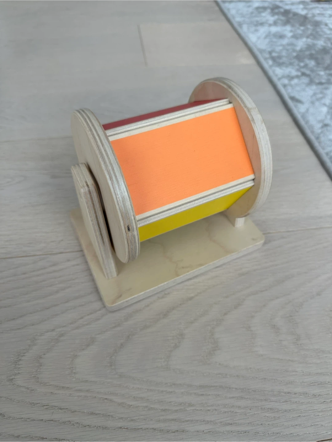 This wooden rolling drum toy is made with natural wood and has colourful panels. It's a fun tactile and visual toy for little ones. Encourages motor skills and sensory exploration.
