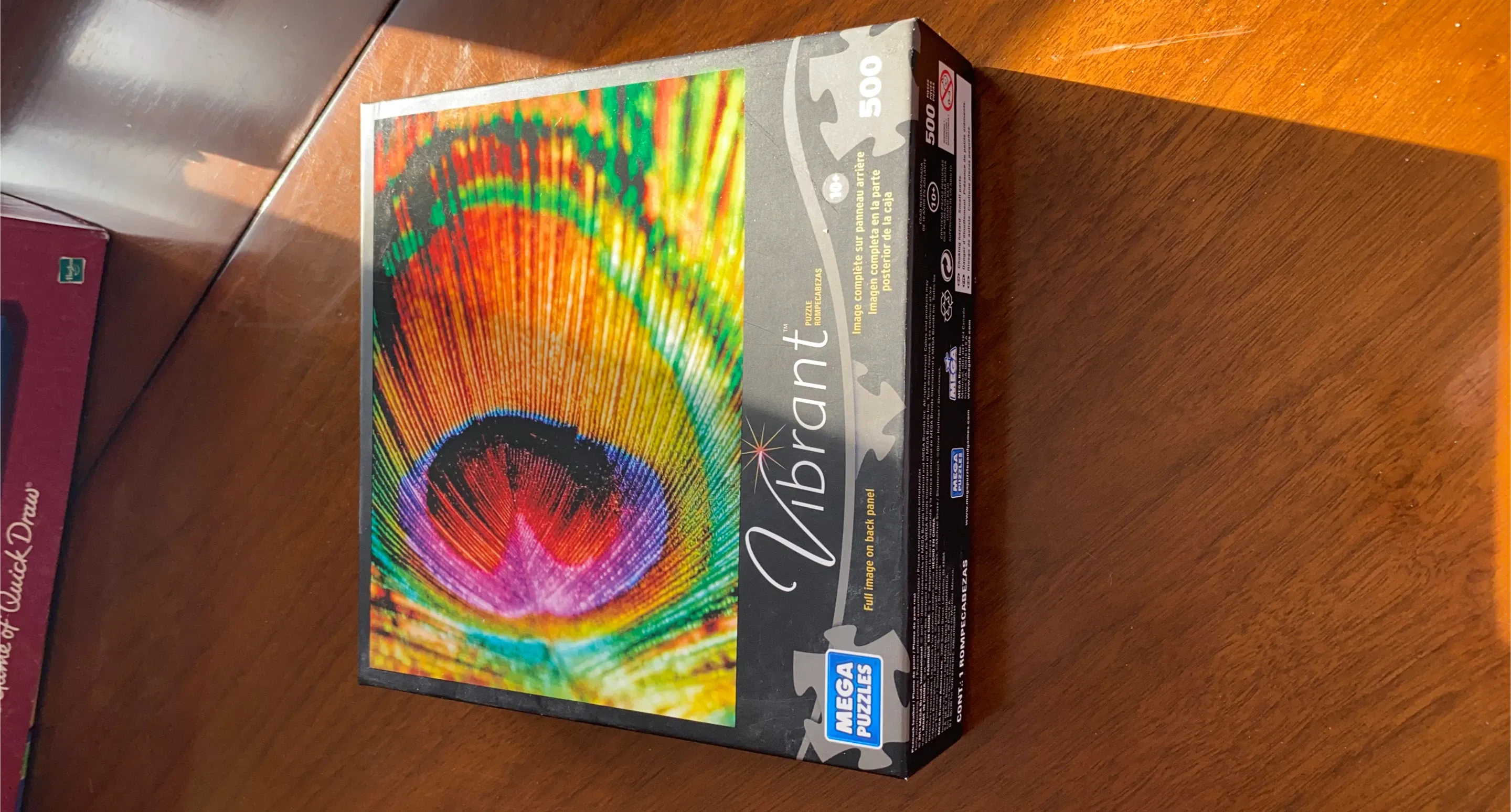 Vibrant Mega Puzzles jigsaw puzzle featuring a detailed peacock feather design. It includes 500 pieces and is recommended for ages 10 and up. Full image of the puzzle is shown on the back panel of the box.