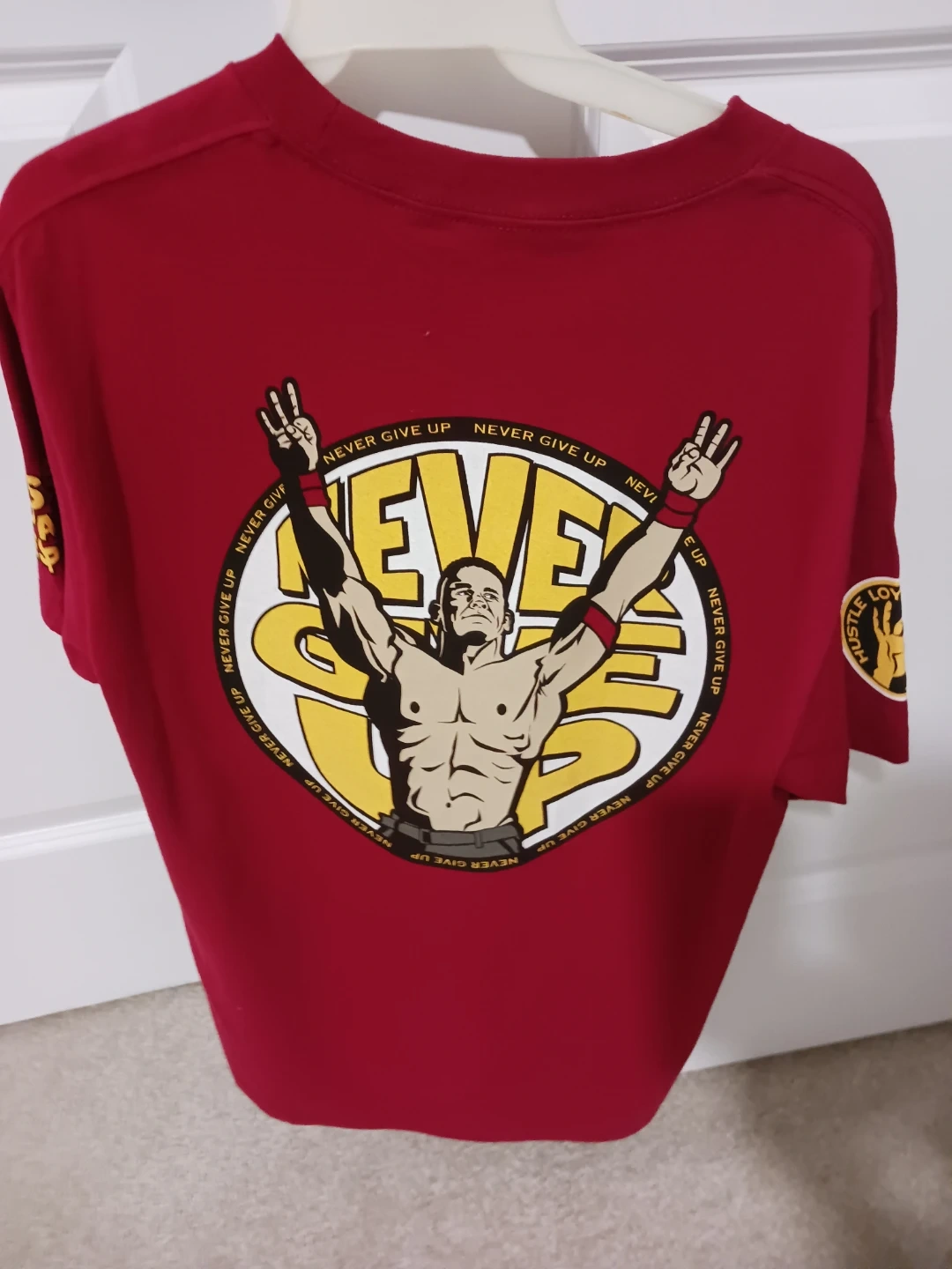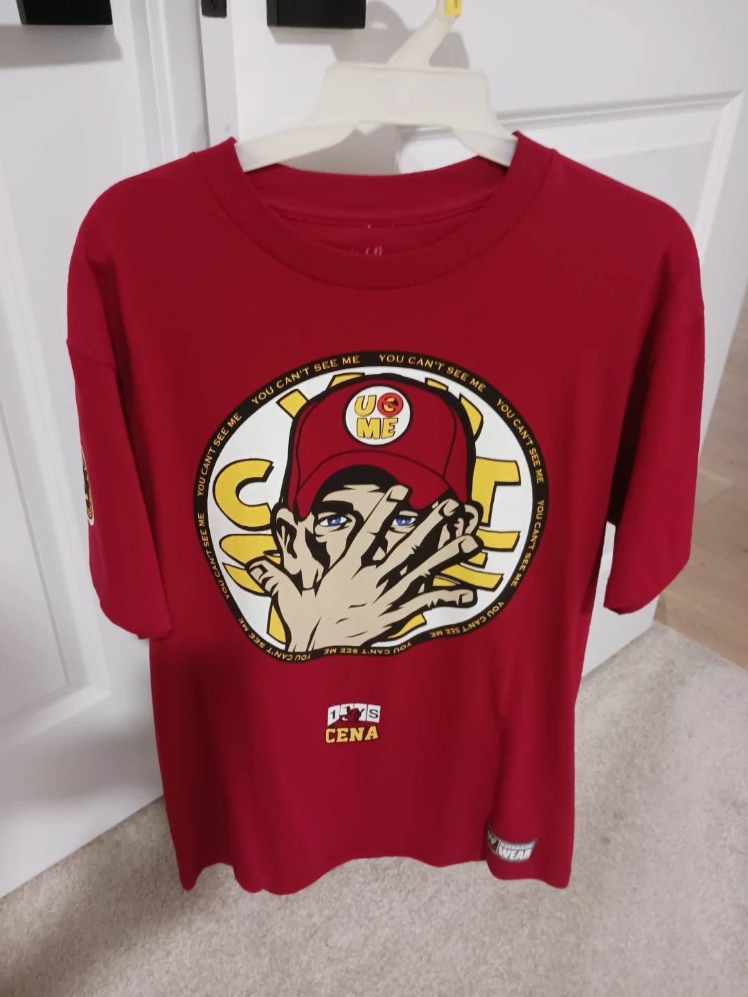 This red t-shirt features John Cena with his signature "You Can't See Me" and "Never Give Up" graphics. It's size medium. This shirt is great for wrestling fans!