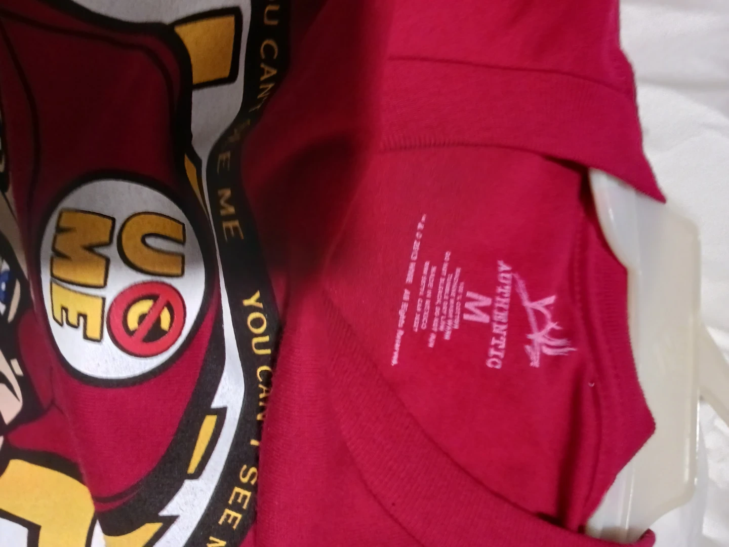 This red t-shirt features John Cena with his signature "You Can't See Me" and "Never Give Up" graphics. It's size medium. This shirt is great for wrestling fans!