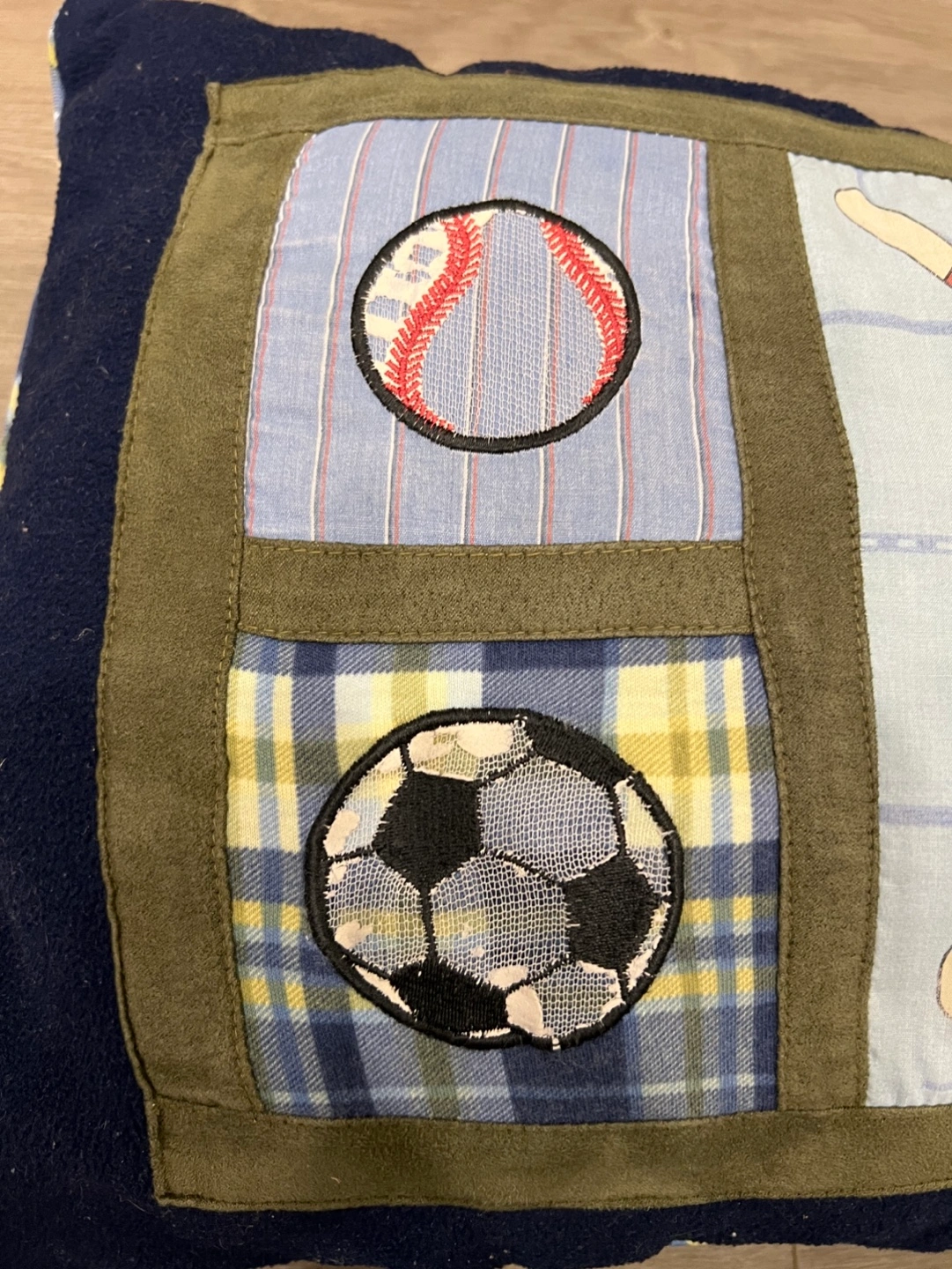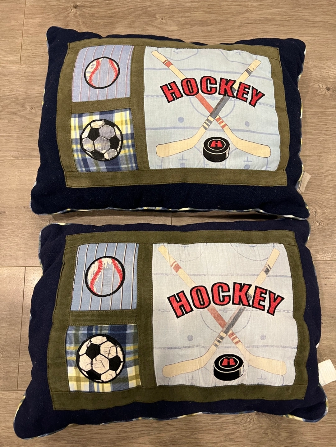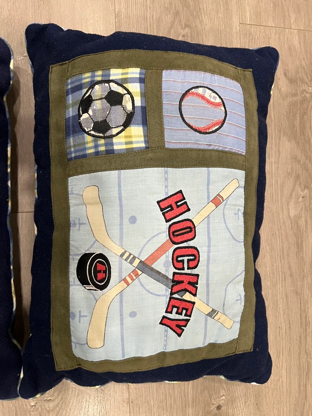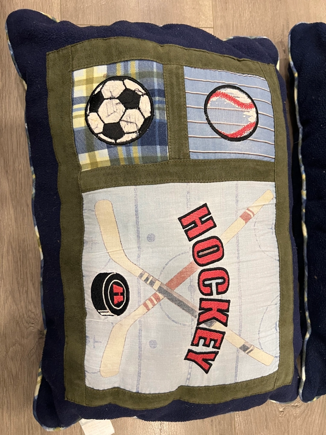 Two rectangular pillows. Features appliqued sports imagery: hockey sticks, puck, baseball, and soccer ball. Blue, green, and navy colour scheme. Fleece-like backing.