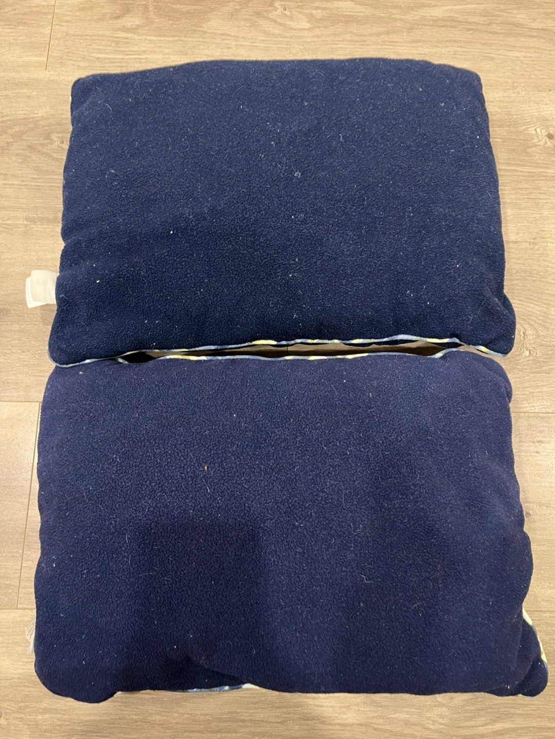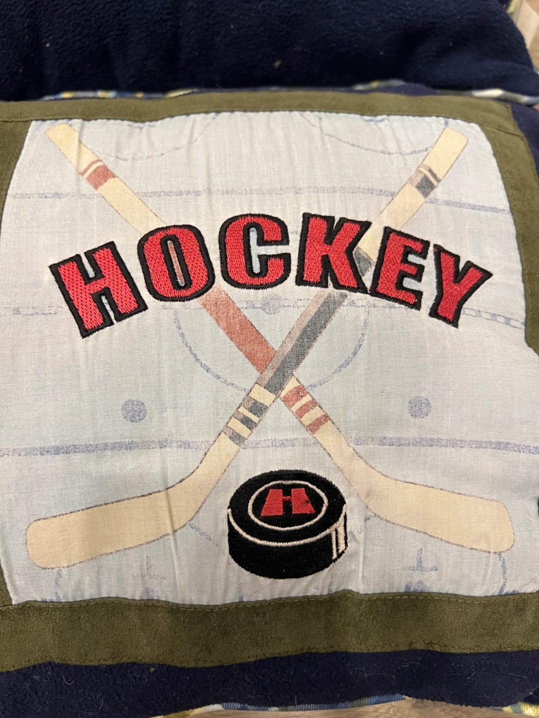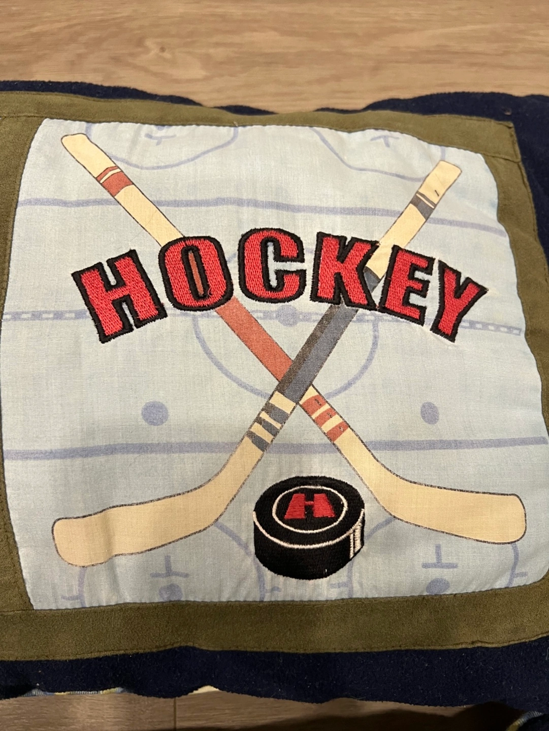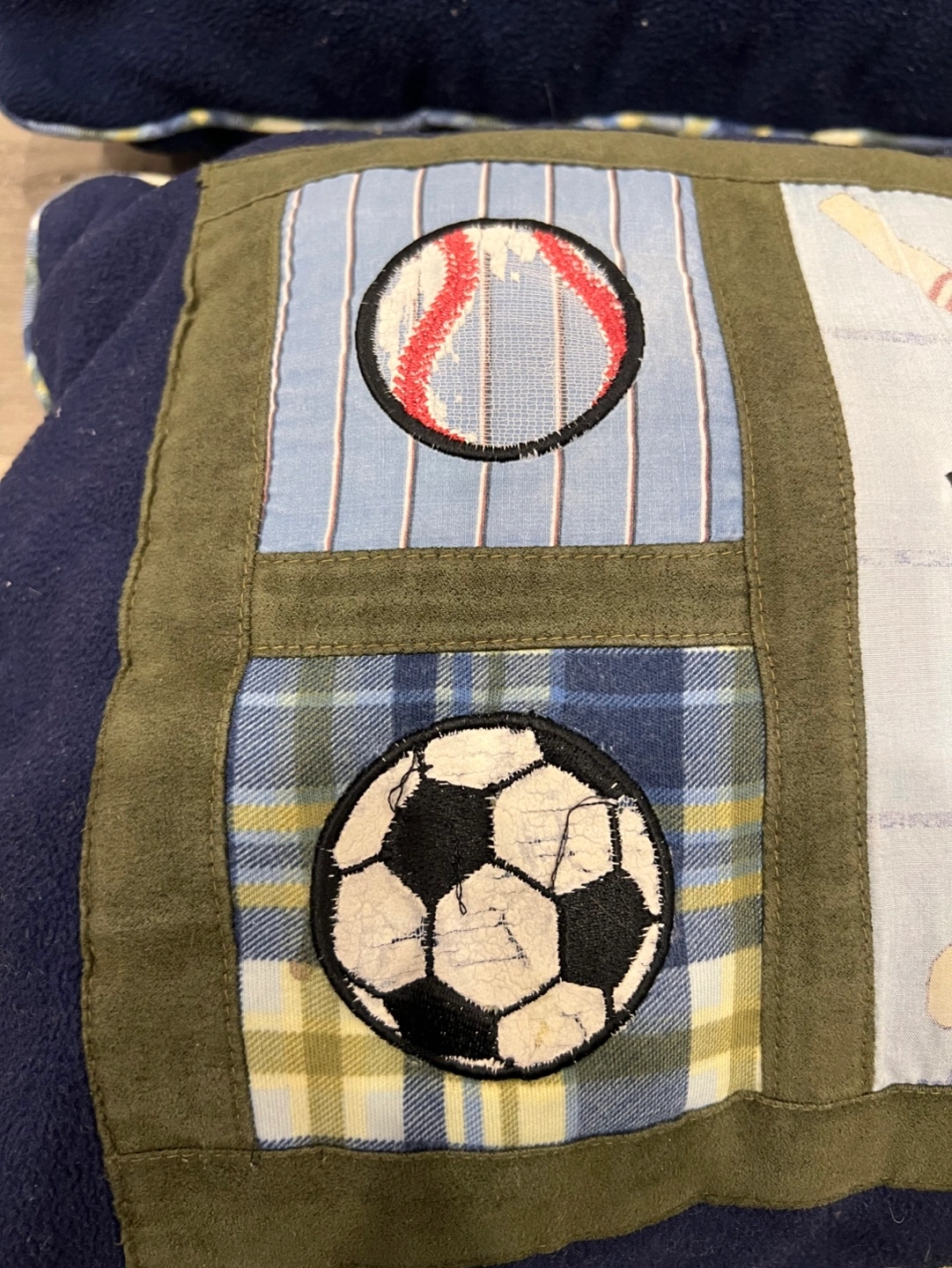 Two rectangular pillows. Features appliqued sports imagery: hockey sticks, puck, baseball, and soccer ball. Blue, green, and navy colour scheme. Fleece-like backing.