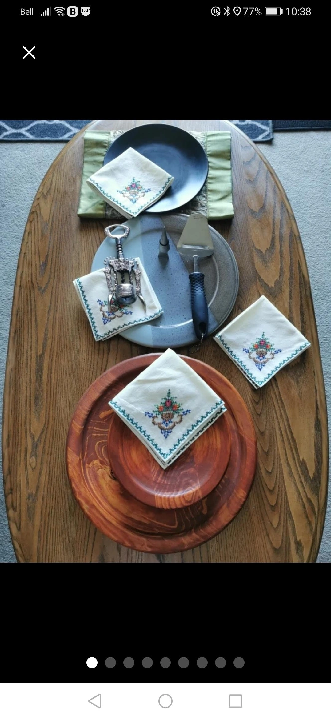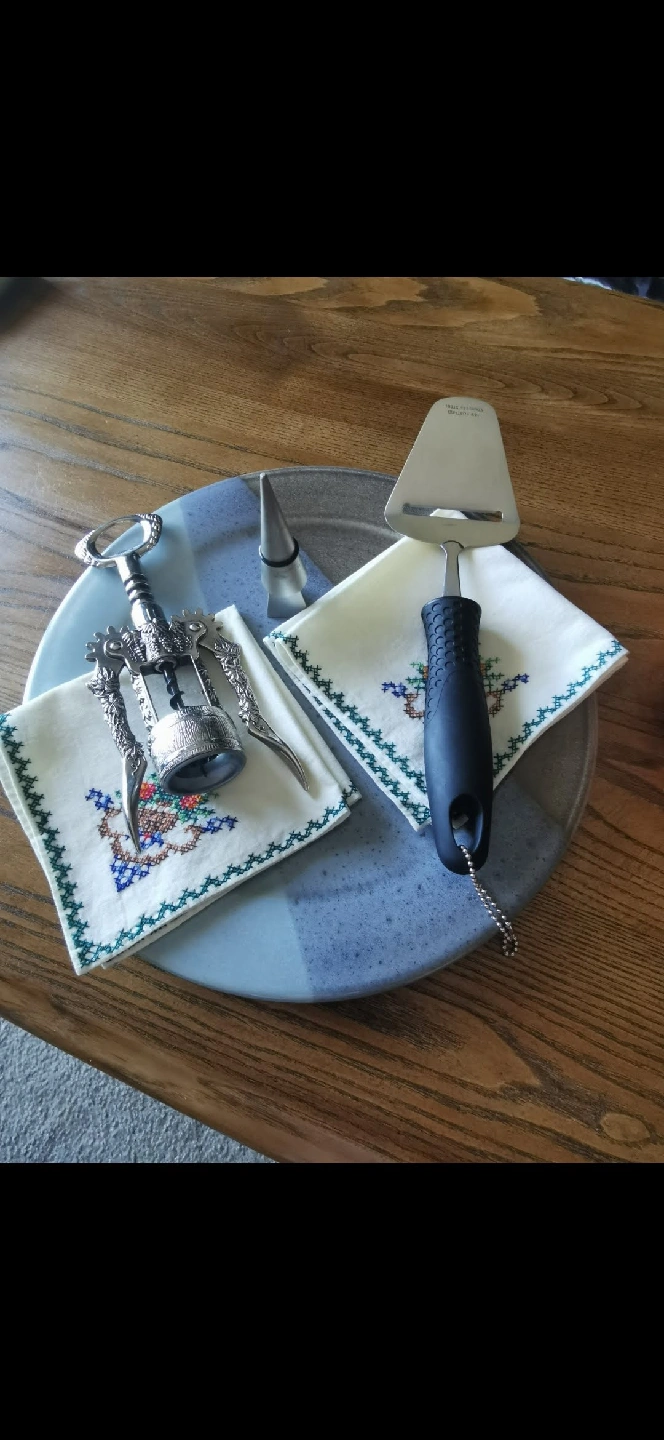 960My 13 piece Wine and cheese party set is perfect for any gathering of friends or family to enjoy cheese, fruit and/or wine! It includes three wooden treated trays, a Pewter Wine bottle opener, a cheese grater, four embroidered napkins and a bottle stopper and 2 stonewear dishes and a green table runner! The pewter wine bottle is worth this deal alone!! Curbside pickup M-Sat 5pm-9pm