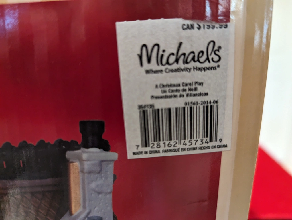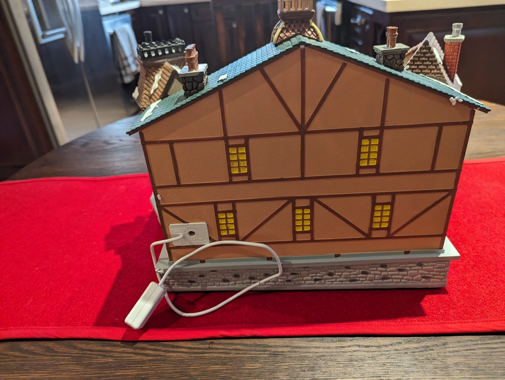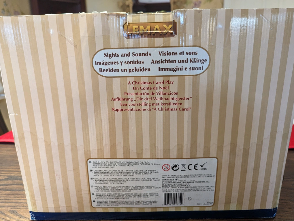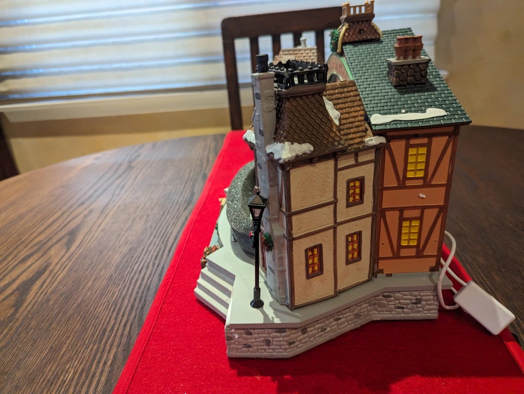 This is a beautiful, detailed musical display. It is electric, with an on/off switch. It is based on "A Christmas Carol" and features Tiny Tim on his father's shoulders. The figures rotate, while the song "God rest ye Merry Gentlemen", plays.