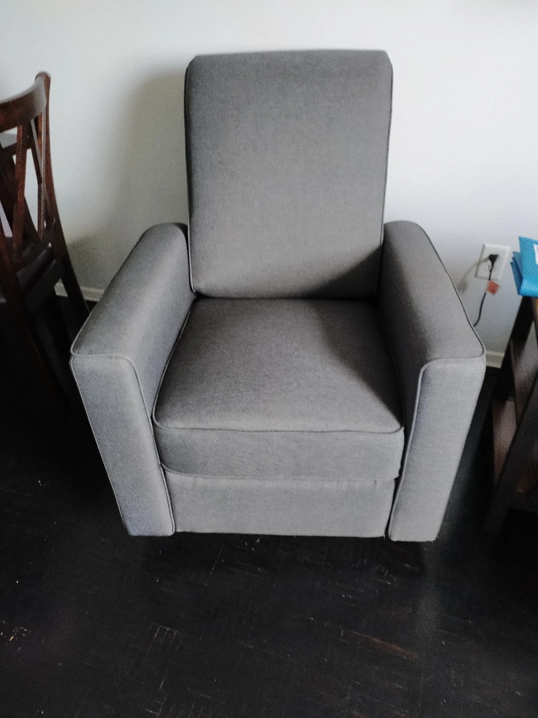 Grey upholstered armchair. It's a comfortable single-seat chair with padded arms and a tall back. Fabric material.