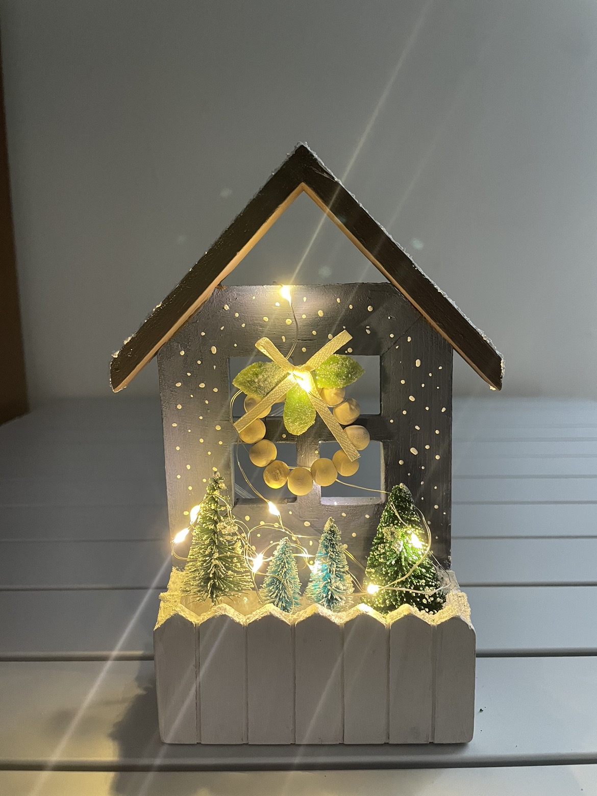 Christmas window decoration with lights. Hand painted and comes with lights (batteries are replaceable).