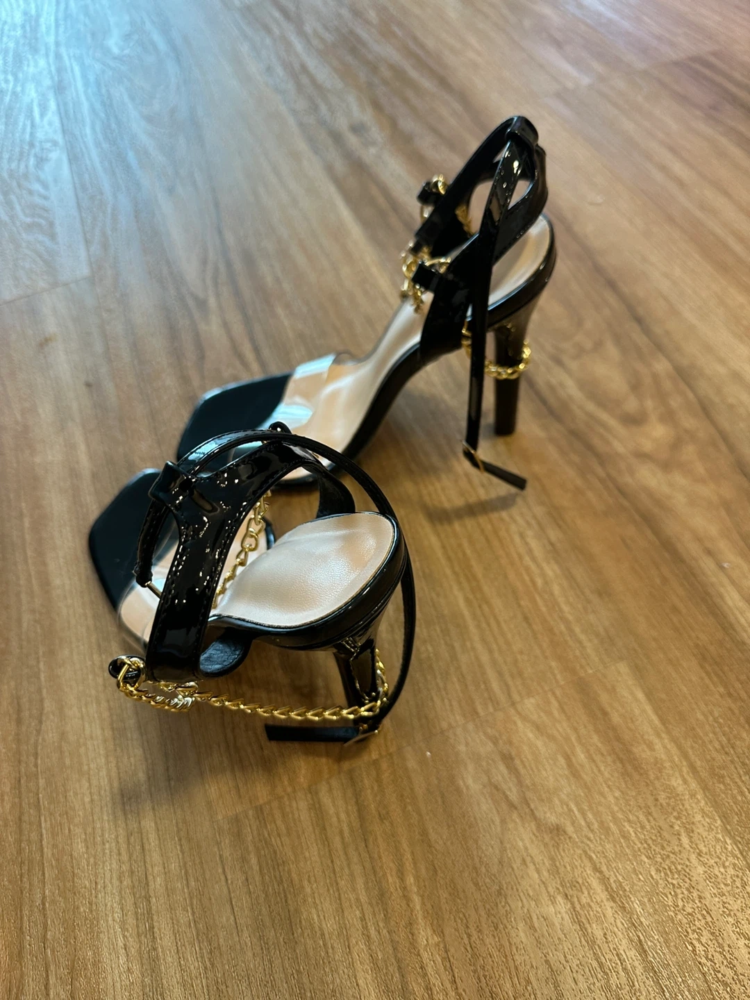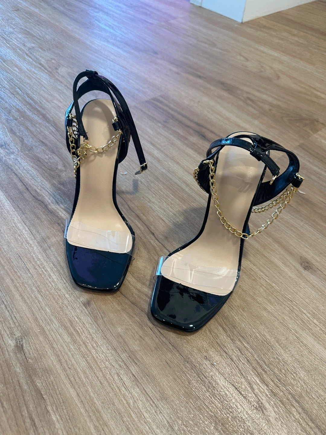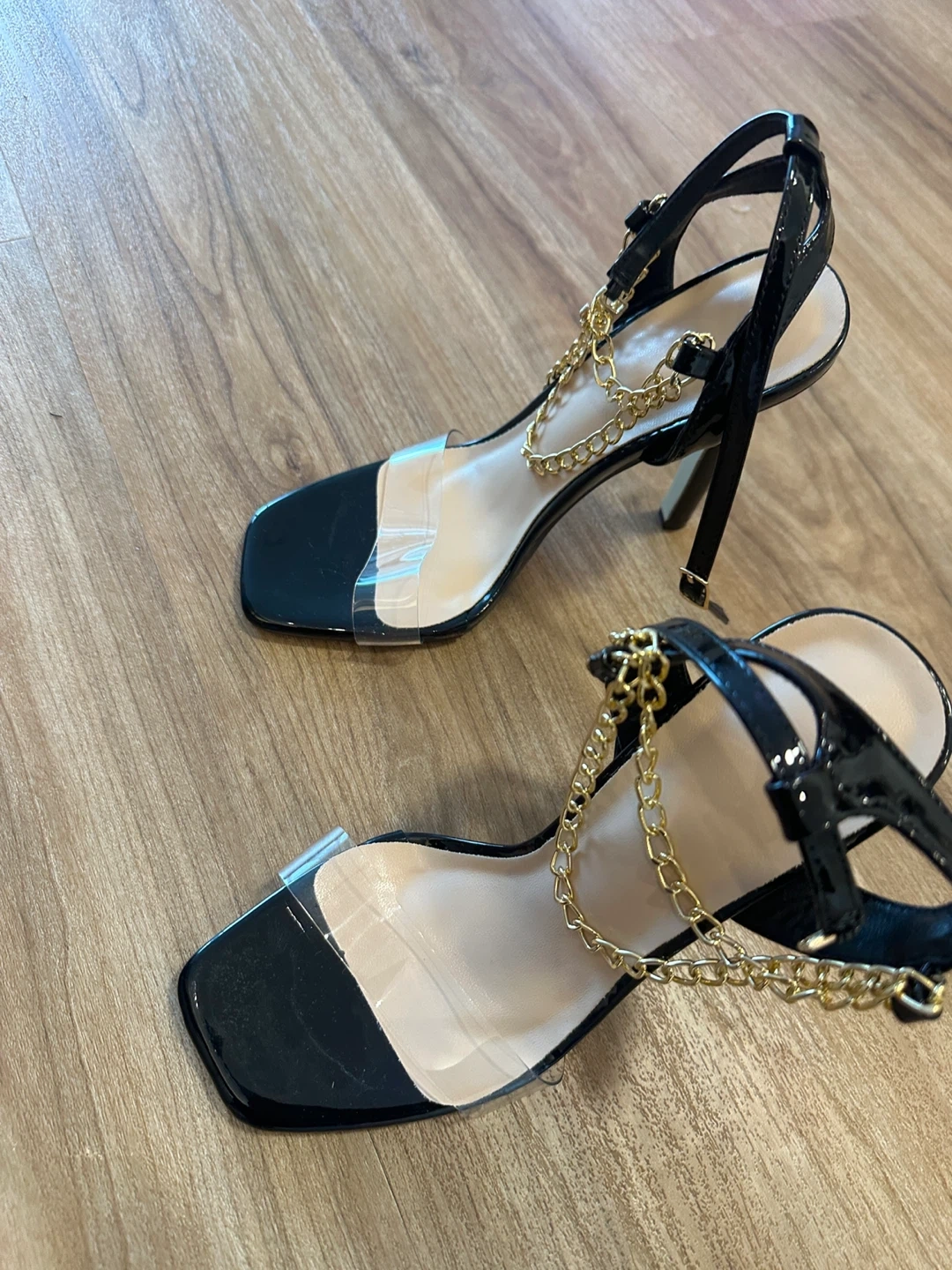 These stylish black heels feature a clear strap and a chic gold chain detail. They're perfect for dressing up any outfit! They appear to be in great condition and ready for a new home.