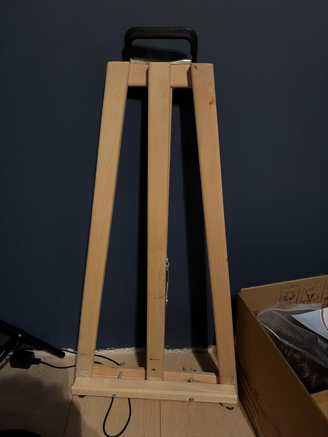 A sturdy wooden easel for artists. It's made of natural wood and features a portable design with a carrying handle. This easel is suitable for displaying canvases or as a painting stand. It folds for convenient storage.