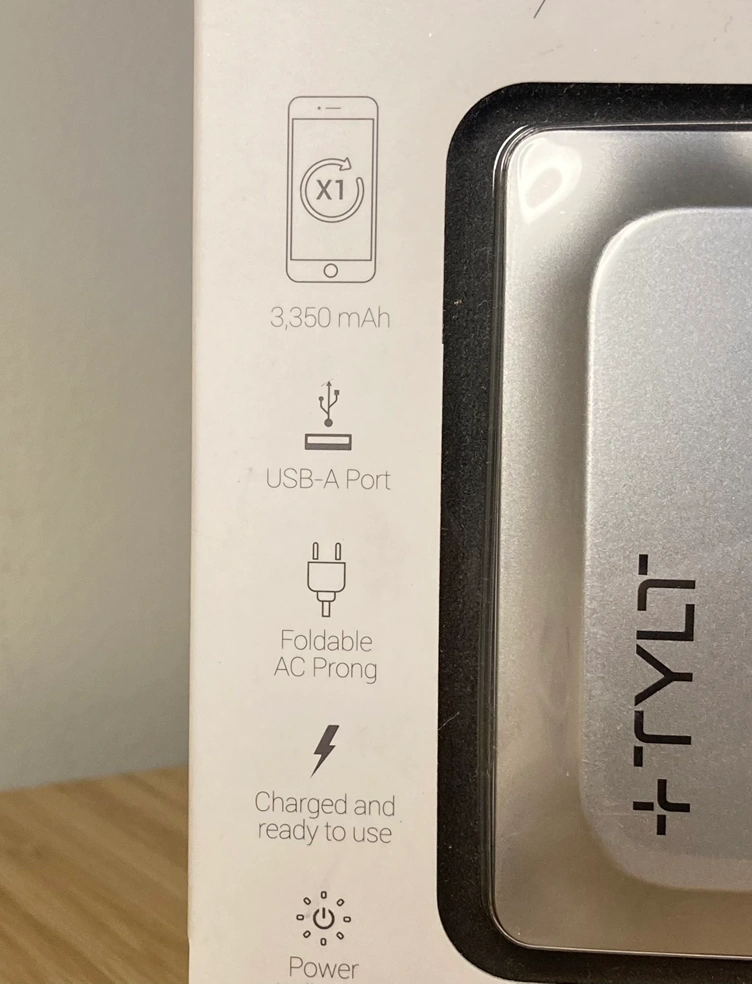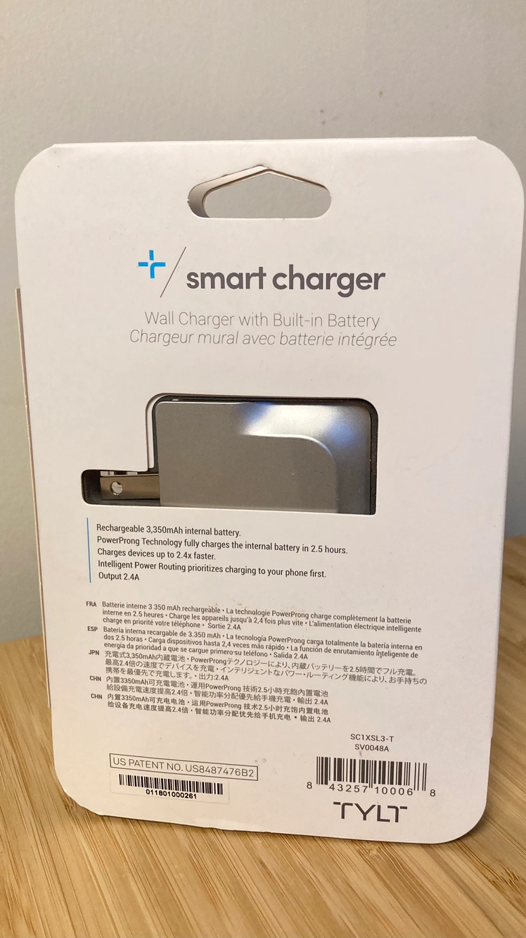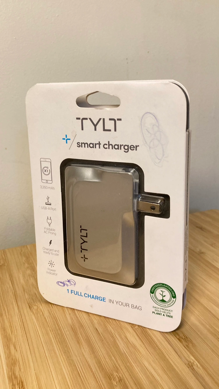 BNIB portable phone charger. Lightweight. Rechargeable with a convenient foldable wall prong. USB-A input compatible with iPhone and Android.