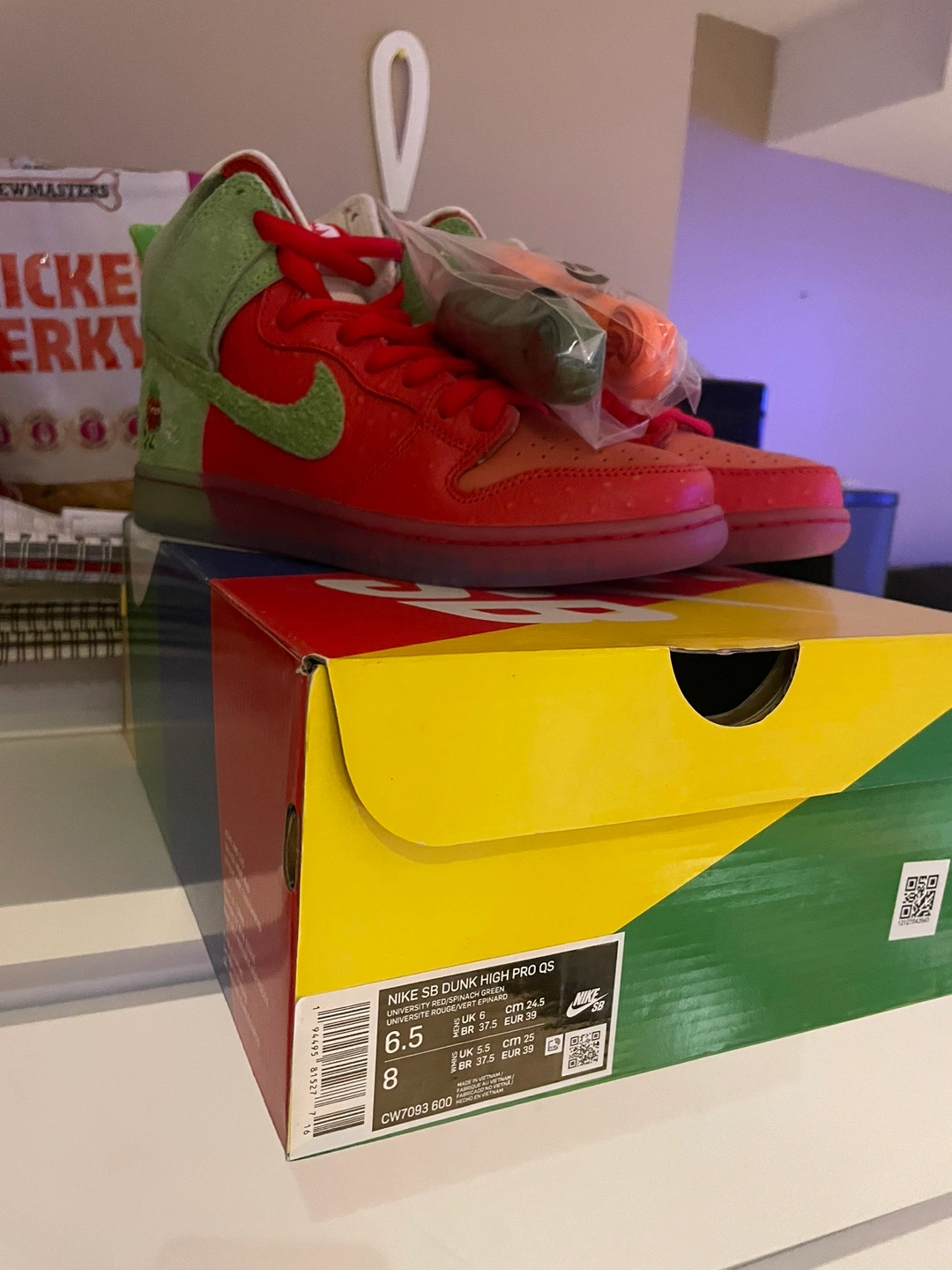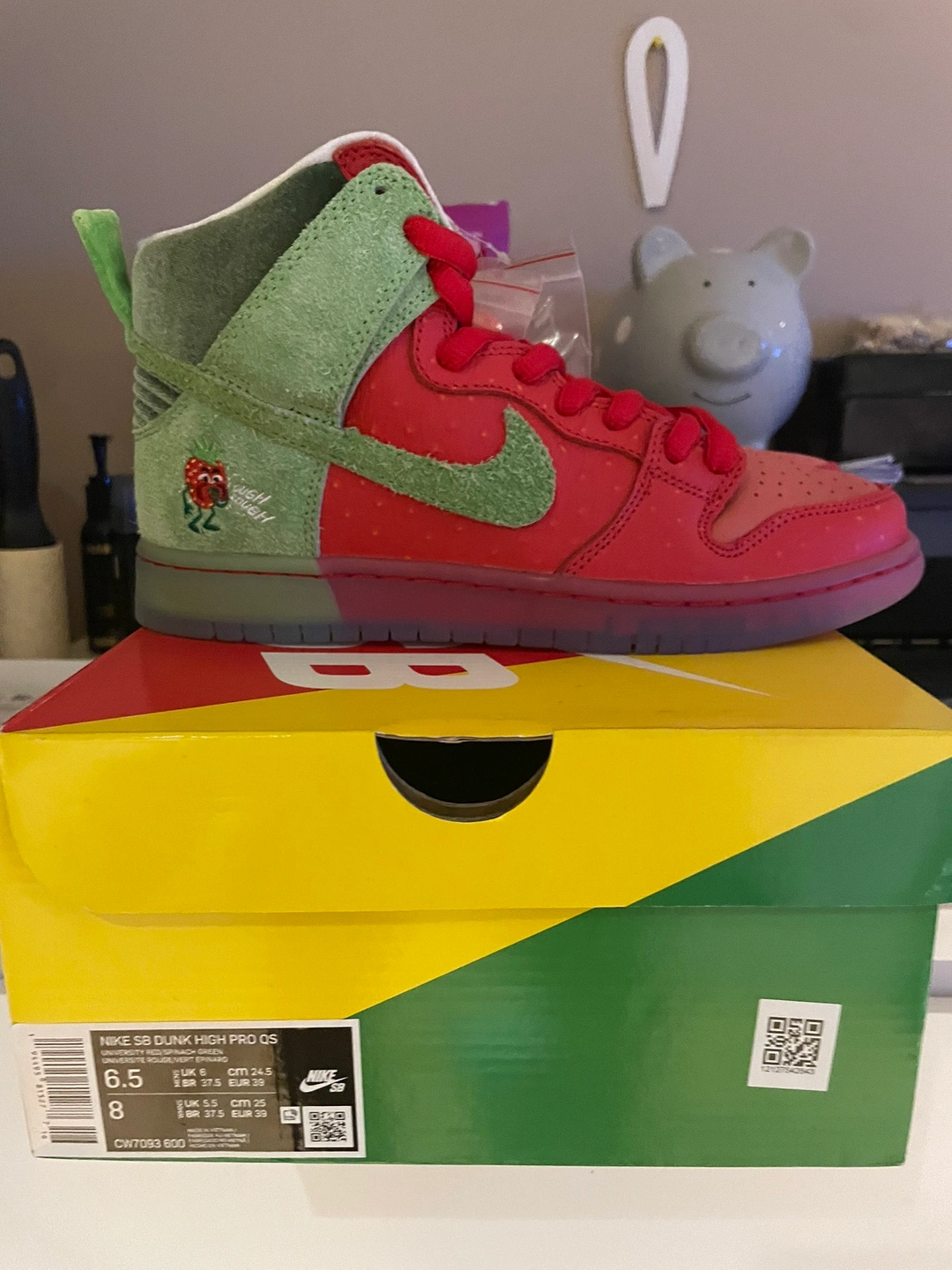 Brand new pair of Nike dunk, high strawberry coughs cheaper than stockX, or any other reseller. Very sad after shoe. Great shoe to add to your collection. Unique colour way with premium suede. Not an every day find Get it while you can.