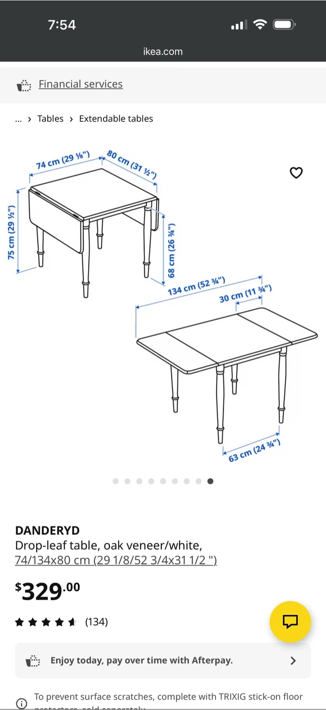 This is the IKEA DANDERYD drop-leaf table, finished in oak veneer and white. It's a versatile table that can extend from 74 cm up to 134 cm in length, with a width of 80 cm and a height of 75 cm. Perfect for smaller spaces that need occasional extra room!