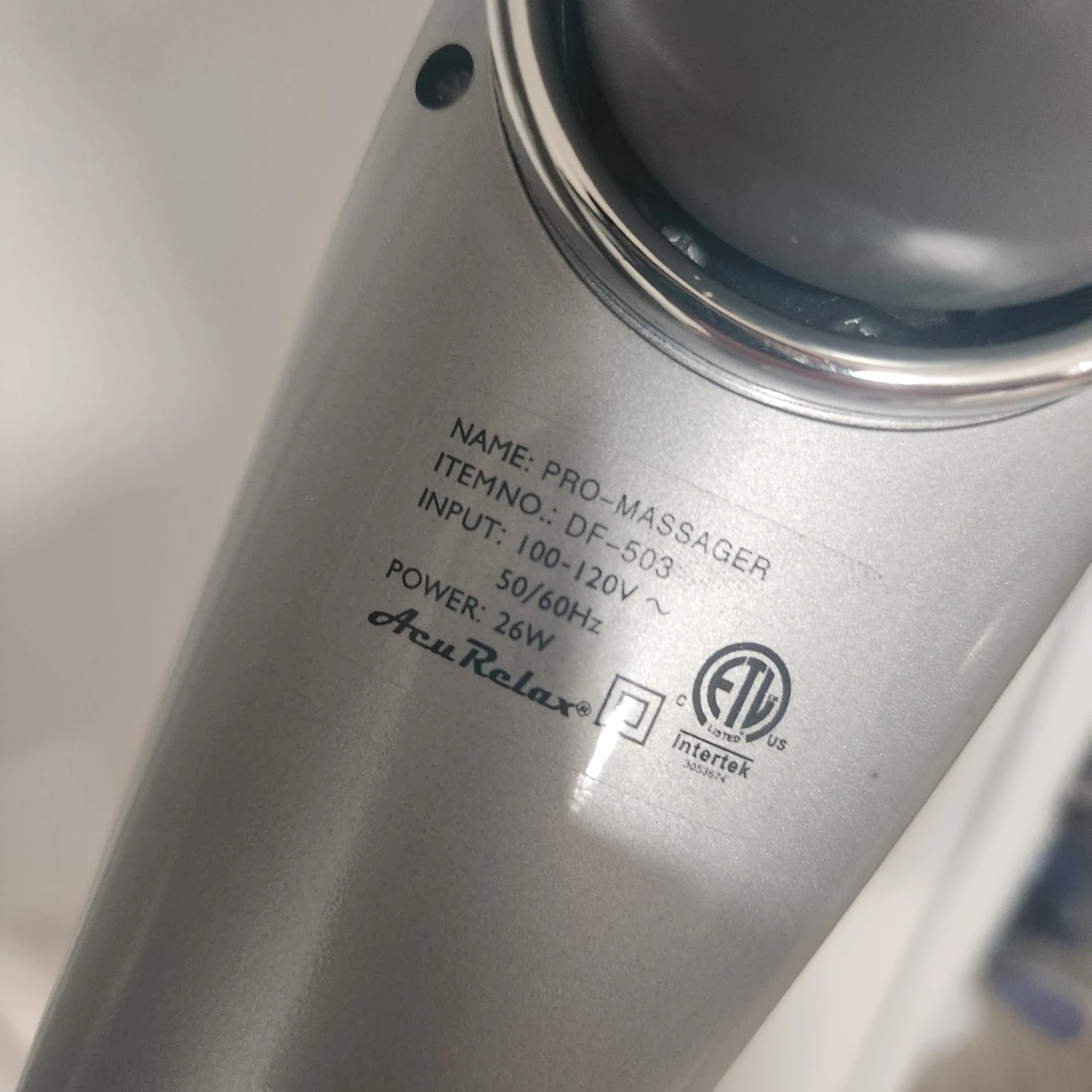 This is an AcuRelax Pro-Massager, model DF-503. It's a handheld massager with a 26W power consumption. The device operates on 100-120V input and 50/60Hz frequency. It's useful for targeted muscle relief.