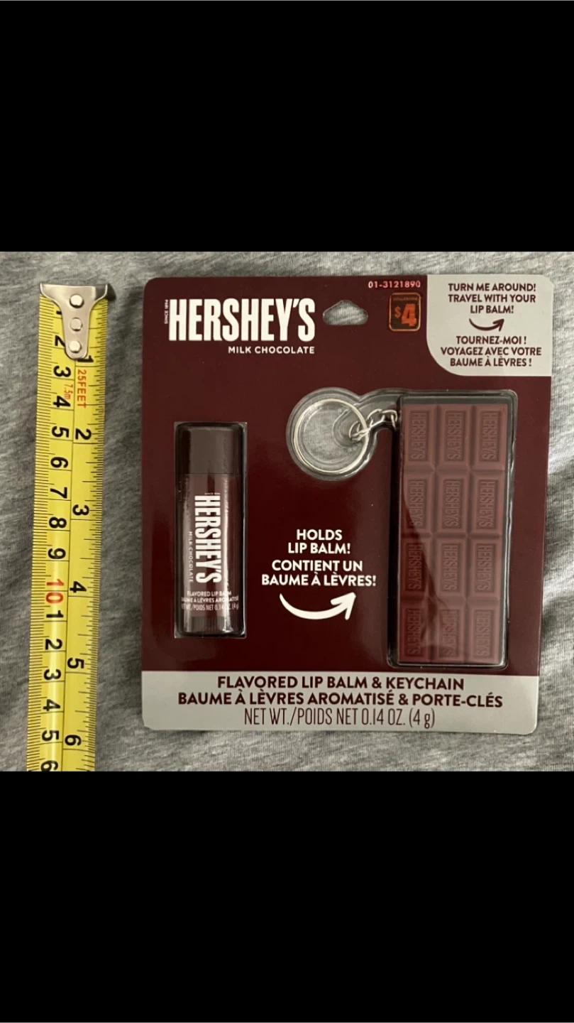 This Hershey's Milk Chocolate flavoured lip balm and keychain set is perfect for chocolate lovers or anyone who loves a sweet treat. The lip balm comes in a handy twist-up tube and the keychain is designed to look like a miniature chocolate bar. Keep your lips moisturized and your keys handy with this fun accessory!