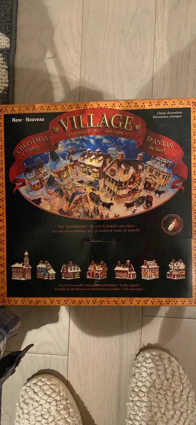 Christmas village with seven paper board buildings re-creating 19th century New England town. Assembly required and light set included. Never used.