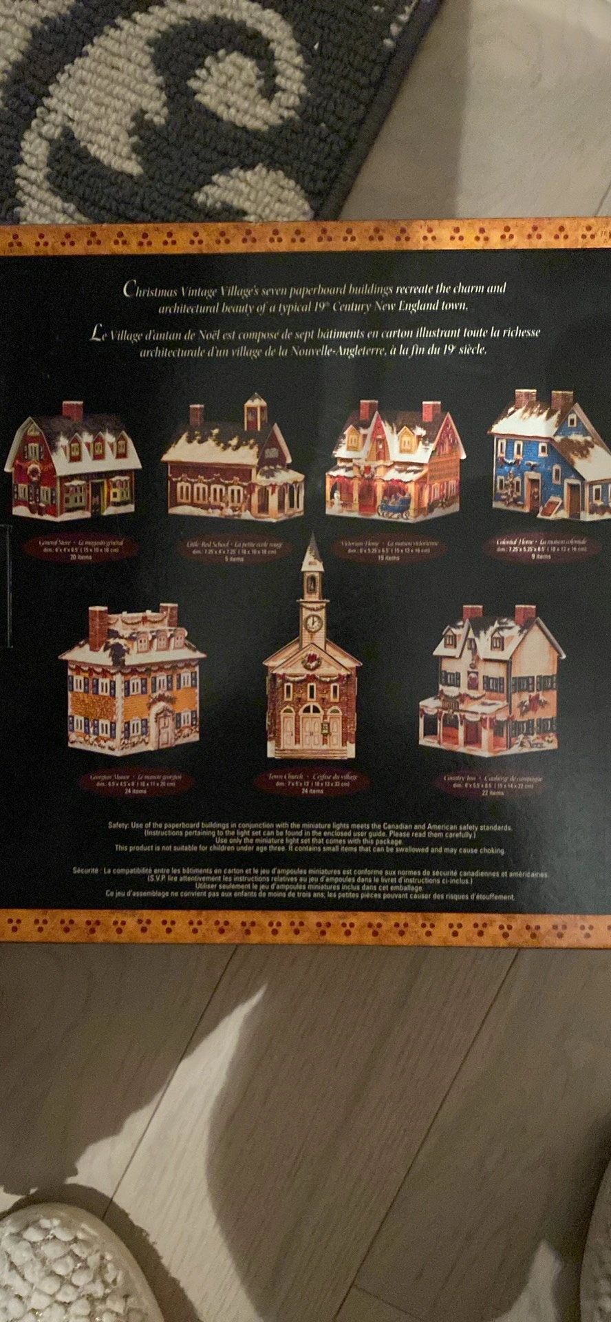 Christmas village with seven paper board buildings re-creating 19th century New England town. Assembly required and light set included. Never used.
