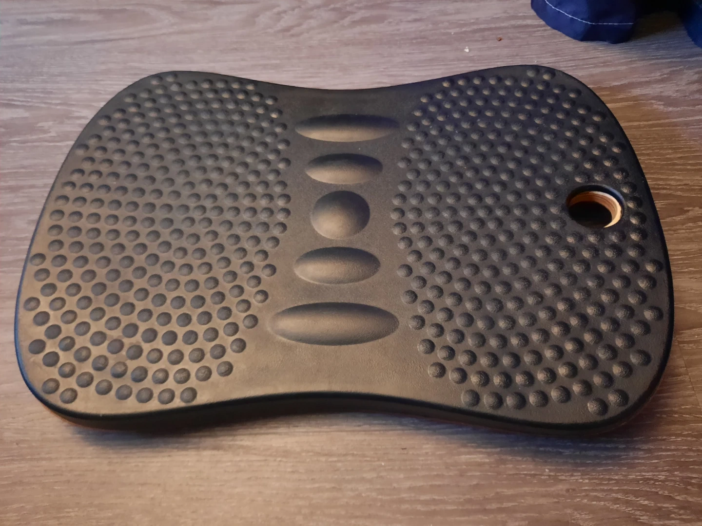 Balance board used for improving core strength, balance, and posture. Non-slip textured surface and ergonomic shape for comfortable use. Great for home workouts, physical therapy, or standing desk use. Durable and lightweight with built-in handle for easy carrying.
