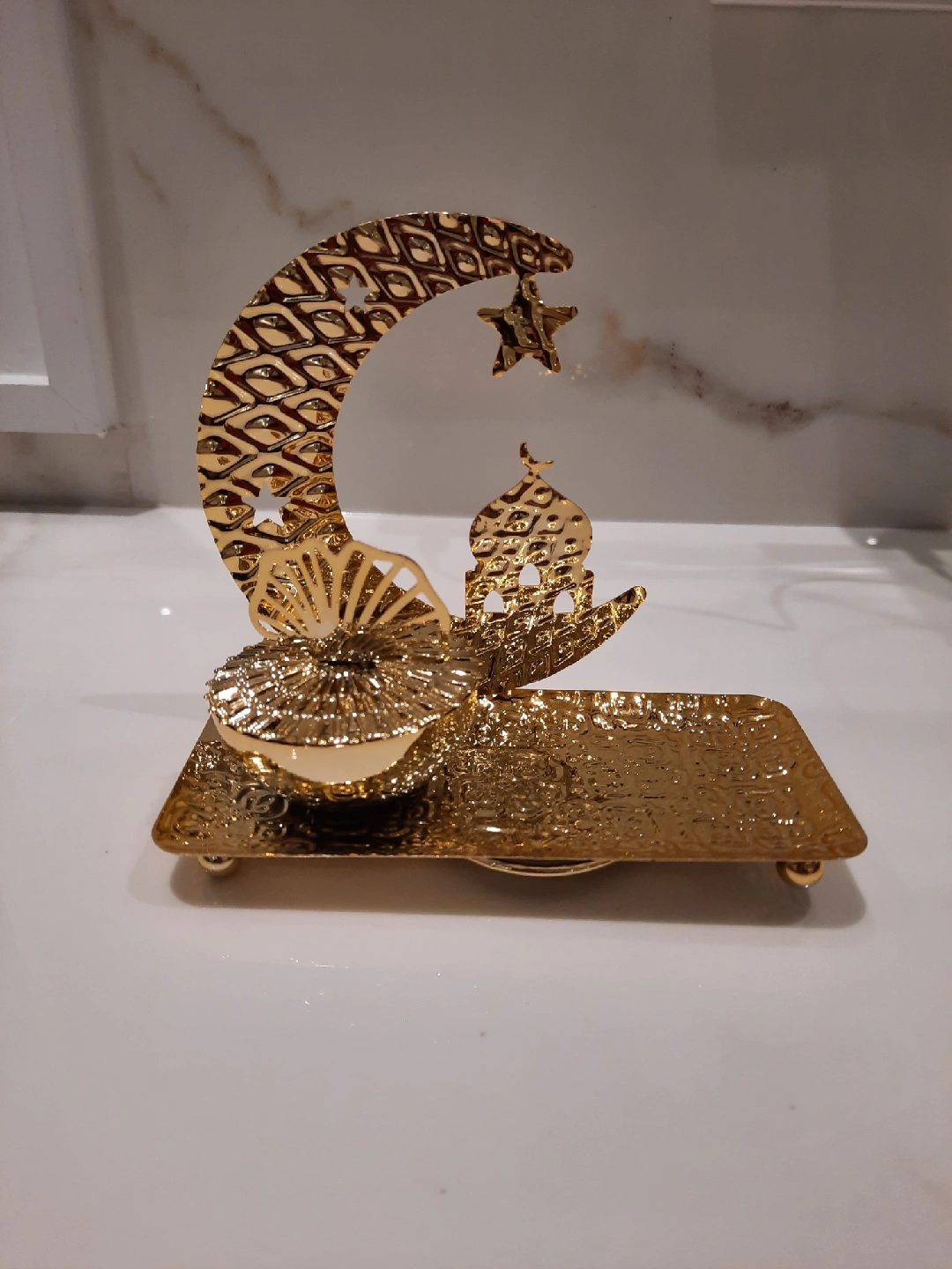 Beautiful gold-coloured Ramadan decoration featuring a crescent moon and star design. Perfect for adding a festive touch to your home during the holy month