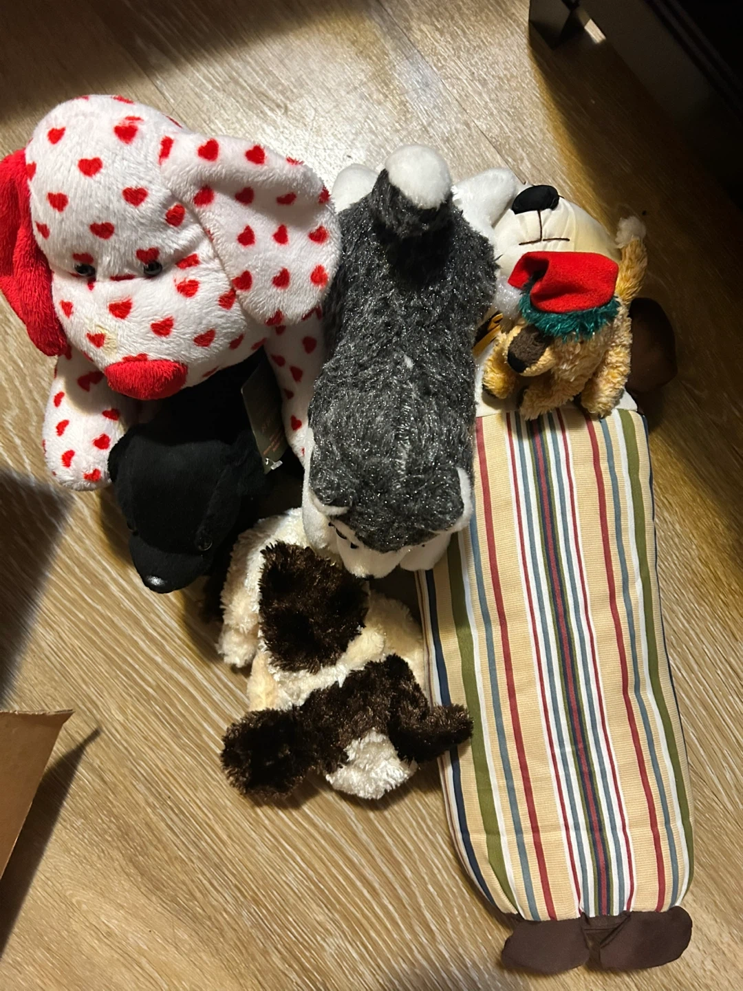 Collection of five plush dog toys. Features a large white dog with red hearts, a black dog, a husky, a brown and white dog, and a small golden dog with a Santa hat. Made from soft plush material.