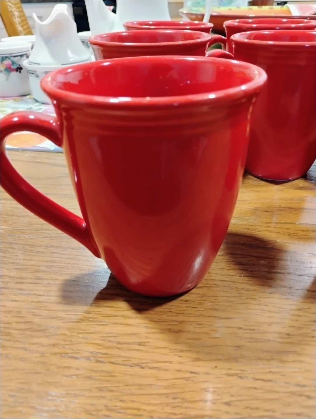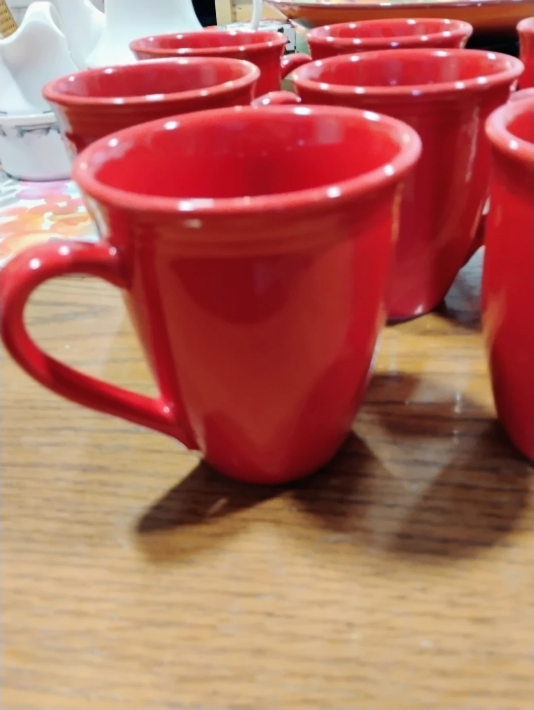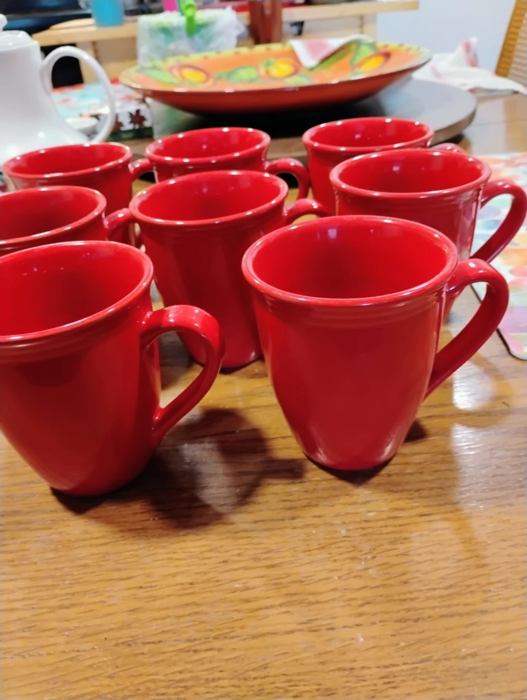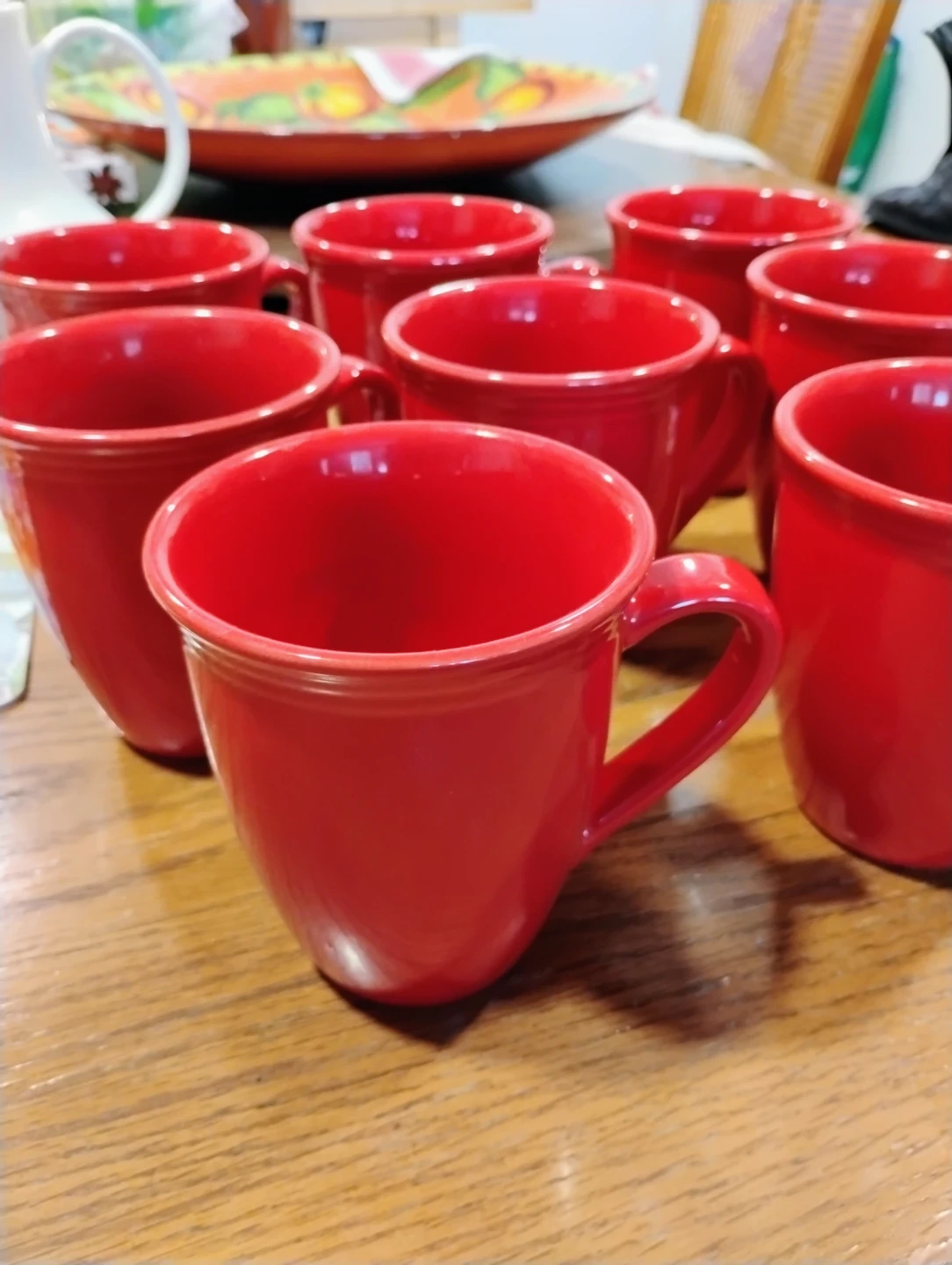 This set includes eight red Oneida Culinaria mugs. Fully vitrified stoneware material. They're dishwasher and microwave safe. Useful for everyday beverages or entertaining guests!